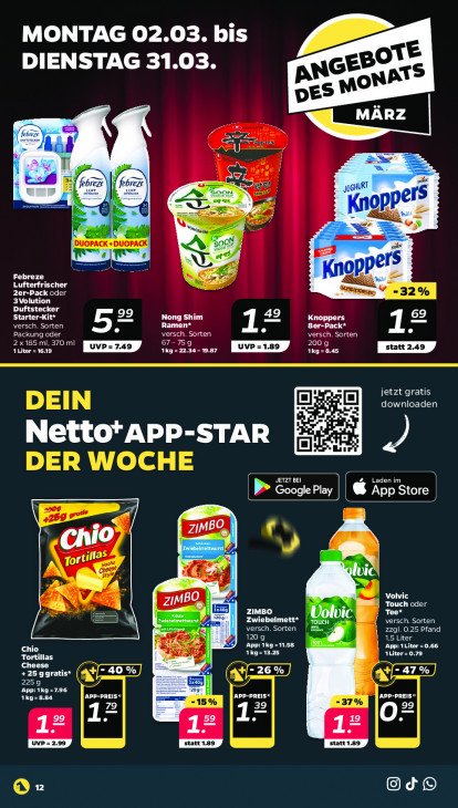 Bitte beachten Sie, dass dieser Text automatisch generiert wird und möglicherweise Fehler enthältMONTAG 02.03. bis DIENSTAG 31.03. NG ATS s M oN — = er C7, 7 27 JURT $ Pe == Ze = er z NL“ Febreze ID EE 2 Zer-Pack oder Lufterfrischer 3Volution u Duftstecker Starter-Kit* 99 Nong Shim 49 Knoppers 69 NE ech} NE ec) Ramen* 8er-Pack* ME Cu 2x185 ml, 370 ml IE 67-759 200 g 1 Liter = 1619 1kg = 22.34 - 9.87 1Kg=8.45 Len jetzt gratis downloaden À Netto’APP-STAR | ran JETZT BEI 4 Google Play C Kog Store | jo En «ch ES | | G UIC Volvic EL | a B a Touch oder ZIMBO Volv 4 Tee* Zwiebelmett* versch. Sorten eo) ME Cu) zzgl. 0.25 Pfand App: 1kg=11.58 on. 1,5 Liter ‚App: Liter =0.66 Tortillas Chio 1kg=13.25 rx Cheese +25 ggratis* -40% = 26 % =47 % 2259 LTÉE" ER ET APP-PREIS APP-PREIS" CES 17 EE th 19 O* 1 Luvp - 2.09 IE @Od®