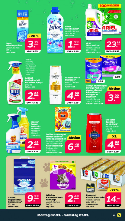 Bitte beachten Sie, dass dieser Text automatisch generiert wird und möglicherweise Fehler enthält100 WÄSCHEN BA re A ze] IS TESTEN © we lenor Fe. 8 = en ve ARIEL on ARIEL ZAn-mErnSch ft =20 % seront î L z = statt 4.79 UVP =2.59 UVP =29.99 BIG PAG en LEA GRATIS Festen rai 7.99 100! 3.99 Aktion FA 18 N UVP = 3.49 UVP= 5.99 = a 5 SW a & Erg ==, » masse 5 RÜFEN ISCHEN Aktion XL 8 ES FE UVP= 2.79 Tr UVP = 5.99 < = 8 ES | | LAS ssgeat ] 3 HYGIEN EIGEN Ps ESS | Et =27% Whiskas Puss; t Catsan Katzentrocken- Classic Aluschale*| Hygiene Plus Katzenstreu* > Ba versch. Sorten nahrung* LE versch. Sorten 14 18 Liter UVP = 12.99 800g 1 Schale = 0.30 64x100g 1 Liter = 0.56 1kg=31 UVP = 2.99 1Kg=219 statt 19.20 Montag 02.03. - Samstag 07.03. 13