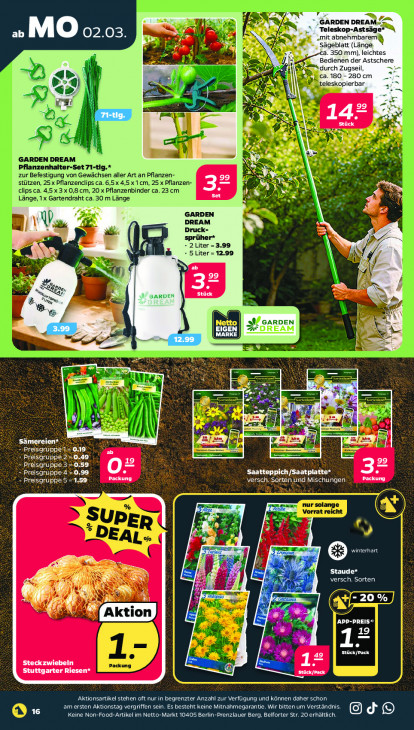 Bitte beachten Sie, dass dieser Text automatisch generiert wird und möglicherweise Fehler enthält2% sx 2 > "GARDEN DREAM An Teleskop-Astsäge’ ab MO 02.03. 4 „mit abnehmbarem| At ER; " Sägeblatt (Länge ki a. 350 mm), leichtes N Bedienen der Astschere durch Zugseil \ ù > a. 180 280 cm PN 4 teleskopierbar, €» N A m I xs Stück d NR N; + : 4 D GARDEN DREAM 5 U Ne uf Pflanzenhalter-Set 71-tig.+ EIS zur Befestigung von Gewächsen aller Art an Pflanzen- N stützen, 25 x Pflanzenclips ca. 6,5 x 4,5 x 1 cm, 25 x Pflanzen- RAS clips ca. 4,5 x 3 x 0,8 cm, 20 x Pflanzenbinder ca. 23 cm Se N Länge, 1x Gartendraht ca. 30 m Länge zn =) GARDEN (P DREAM N Druck- Di = sprüher* # ( 2 Lite (Hs 5 Liter = 12.99 2 8 x 33 He. NE GARDEN Stück no à ws AY carven | à = aut ge un; A Dr 1 Le Te 8 Er = As ve 2 ES" er _ 2 AN ? Sämereien* Parse) Vee pd 49 ee er = Re 219 Preisgruppe 89 Et ÉTIENNE CS 32 SEE ton 59 CET versch.Sorten und Mischungen Dem CES SE: Ps rer Dix z Be # à JT Z (4 N EN EN à NE NÉE Cul No oh D oc # RA 4 ZIN x "20% oi PA TE 2 sh #3 En 49 EPL Ell FF Stuttgarter Riesen* Stück/Pack ‚Aktionsartikel stehen oft nur in begrenzter Anzahl zur Verfügung und können daher schon 16 am ersten Aktionstag vergriffen sein. Es besteht keine Mitnahmegarantie. Wir bitten um Verständhnis. © d © Keine Non-Food-Artikel im Netto-Markt 10405 Berlin-Prenzlauer Berg, Belforter Str. 20 erhältlich.