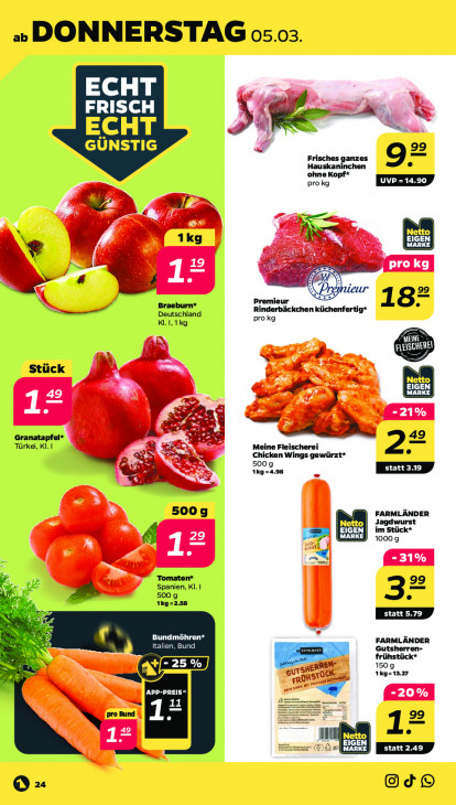 Bitte beachten Sie, dass dieser Text automatisch generiert wird und möglicherweise Fehler enthält» DONNERSTAG 5.03 pee Hauskaninchen Frisches ganzes 9= ohne Kopf* pro kg u PN IT MARKE At BEE Premieur Rinderbäckchen küchenfertig* er 182 Be prokg KlI,1kg (EU ISCHEREI Stück MARKE EIGEN gp À 7 >. 49 Türkei, Kl. I Granatapfel* Has Meine Fleischerei 8 Chicken Wings gewürzt* 500 g 1Kg=4.98 % 500g FARMLÄNDER Netto Jagdwurst im Stück* CAT 1000 g ro Tomaten* Spanien, Kl. | 500 g 1kg=2.58 32 f x Bundmöhren* Italien, Bund FARMLÂNDER frühstück* Gutsherren- EN 1509 1Kg=13.27 LS 1722 kh N 12 RKE EN EED [A E7 @Od®