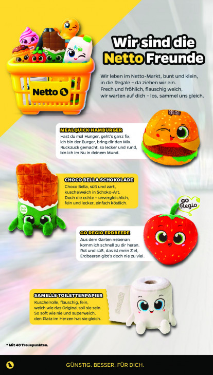 Bitte beachten Sie, dass dieser Text automatisch generiert wird und möglicherweise Fehler enthälta bei = Wir leben im Netto-Markt, bunt und klein, in die Regale - da ziehen wir ein. jan Frech und fröhlich, flauschig weich, Netto @ wir warten auf dich - los, sammel uns gleich 1 QUI an Hast du mal Hunger, geht’s ganz fix, ich bin der Burger, bring dir den Mix. Ruckzuck gemacht, so lecker und rund, bin ich im Nu in deinem Mund. Choco Bella, süß und zart, kuschelweich in Schoko-Art. Doch die echte - unvergleichlich, à fein und lecker, einfach köstlich. Regio Aus dem Garten nebenan komm ich schnell zu dir heran. Rot und süß, das ist mein Ziel, Erdbeeren gibt’s doch nie zu viel. Kuschelrolle, flauschig, fein, weich wie das Original soll sie sein. © Ÿ So soft wie nie und superweich, den Platz im Herzen hat sie gleich. m) * Mit 40 Treuepunkten. STIG. BESSER. FÜR DICH.