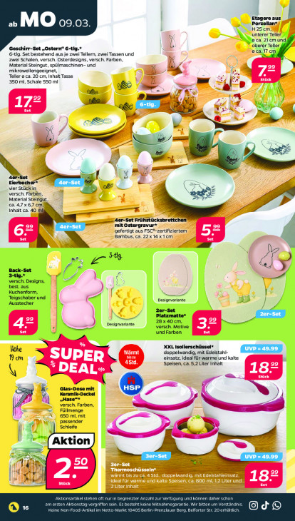 Bitte beachten Sie, dass dieser Text automatisch generiert wird und möglicherweise Fehler enthältEtagere aus b MO 09.03. Porzellan*, \ H25cm, unterer Teller M le ca. 21 cm un oberer Teller Geschirr-Set ,Ostern“ 6-tig.* 6-tig. Set bestehend aus je zwei Tellern, zwei Tassen und © ca.17 cı zwei Schalen, versch. Osterdesigns, versch. Farben, à Material Steingut, spülmaschinen- und we mikrowellengeeignet, Teller 0 ca. 20 cm, Inhalt Tasse 350 ml, Schale 550 ml 7e & 7 1! N ds 8 a Da Sul . Es ee 4er-Set { ej Eierbecher* 4er-Set vier Stück in Ed versch. Farben, Material Steingut, er ca.4,7x6,7cm, À Inhalt ca. 40 mi — >= 4er-Set Frühstücksbrettchen mit Ostergravur* gefertigt aus FSC®-zertifiziertem Bambus, ca. 22x14 x1cm per Stg. ZE Back-Set >, Dept 3-tig.* À versch. Designs, ! best. aus Kuchenform, a Teigschaber und Ausstecher Designvariante 22 2er-Set À / Platzmatte* an 28 x 40 cm, Designvariante versch. Motive und Farben st XXL Isolierschüssel* Hohe doppelwandig, mit Edelstahl- einsatz, ideal für warme und kalte 19 cm Speisen, ca. 5,2 Liter Inhalt \ Glas-Dose mit Keramik-Deckel x h „Hase“* N Js versch. Farben, = Füllmenge 650 ml, mit x passender Schleife | ns re = — 3er-: ED = 49.99 4 = | XL Aktionsartikel stehen oft nur in begrenzter Aı zahl zur Verfügung und können daher schon am rsten Aktionstag vergriffeı in. Es besteht keine Mitnahmegarantie. Wir bi Ph, NT Artik im Ni jarkt 10405 Berlin-Pı erhältlich. Sunn d © [A ES TEE CUS