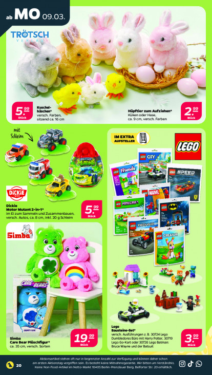 Bitte beachten Sie, dass dieser Text automatisch generiert wird und möglicherweise Fehler enthältb MO 09.03. TRÖTSCH Vv EG » 1% fre At Papi à a Pi A dd Nm N Kuschel- wu häschen* Hüpftier zum Aufziehen* versch. Farben, Küken oder Hase, sitzend ca. 16 cm ca.9 cm, versch. Farben Û IM EXTRA Schleim N AUFSTELLER € ? (xD) > Du SET) vg wl TT us raf SPEED ns ma We an 4 N a = oe % Dickie Motor Mutant 2-in-1* A en) im Eizum Sammeln und Zusammenbauen, versch. Autos, ca. 8 cm, inkl. 20 g Schleim ah le EA U Lo Y Pas @ 4 & @ ze L__ ss 2 x 77725 Na Ya cars saar Eadetsine-set* versch. Ausführungen z. B. 30724 Lego Si Dumbledores Büro mit Harry Potter, 30719 Care Bear Plüschfigur* Lego Go-Kart oder 30726 Lego Batman: ca. 35 cm, versch. Sorten Bruce Wayne und der Batsuit Aktionsartikel stehen oft nur in begrenzter Anzahl zur Verfügung und können daher schon am ersten Aktionstag vergriffen sein. Es besteht keine Mitnahmegarantie. Wir bitten um Verständnis. d © Keine Non-Food-Artikel im Netto-Markt 10405 Berlin-Pr © 2 PON deelne Ke