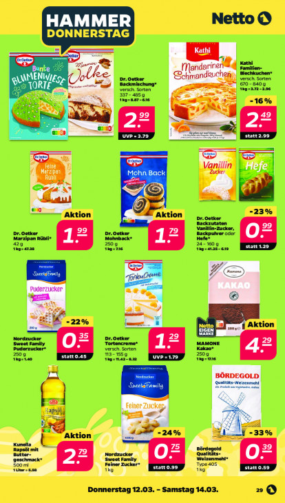 Bitte beachten Sie, dass dieser Text automatisch generiert wird und möglicherweise Fehler enthältNetto © DONNERSTAG TR, Kathi Familien- I versch. Sorten Blechkuchen* Dr. Oetker Backmischung* > 670-8409 X versch. Sorten 1Kg=3.72 -2.96 337-4859 TS 1k9=8.87-616 = "16% uf Sa # —— an gl Jan va De >— "23% Aktion Aktion Dr. Oetker Backzutaten Dr. Oetker Dr. Oetker Vanillin-Zucker, Backpulver oder Marzipan Rübli* Mohnback* Hefe* 429 250 g 24-160 g 1kg=47.38 1kg=716 1kg=41.25- 619 ie 7e =22% Aktion Netto Nordzucker Dr. Oetker Sweet Family Tortencreme* CET Puderzucker* versch. Sorten Kakao* 250 g 13-1559 2509 1kg=1.40 1kÿ=1.42- 8.22 19-716 | _ Feiner Zucker ‚dad -24% -33% Aktion = Qualitäts- et Fa Weizenmehl* ml Typ Ba 1kg [| Donnerstag 12.03. - Samstag 14.03. 2 ©
