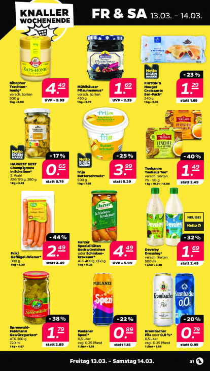 Bitte beachten Sie, dass dieser Text automatisch generiert wird und möglicherweise Fehler enthält5008 — un, Raps-HoNIG TURKO! FINTON’S Trachten- Binoptann Mühlhäuser honig* Pflaumenmus* Croissants Nougat Æ versch. Sorten 4= versch. Sorten 12 5er-Pack* 5009 4509 2409 1Kg-8.98 Ig 1kg=-5.38 = Butte: 2 sehmalz X ET = PEIRSICH | Ber; AOUJA Et 4 EEHAUS ja = cs 4 Butter- De FENG! EU ca Schmalz ANIS-KÜMA PP à HARVEST BEST Champignons Teekanne in Scheiben* frija Teehaus Tee* 3. Wahl O= Butterschmalz* Ea versch. Sorten ATG 1709, 280 9 5009 76-909 Ikg=2.82 1kg=798 kg = 19.61 - 16.56 u - nd [Tr 34 } Harzer 49 Spez! BASED Develey Friki oder Schinken- 42 Dressing* Geflügel-Wiener* krakauer* versch. Sorten 300 g ATG 400 9, 6509 500 ml 1kg=8.30 1kg=1123 _UVP=5.99 | 1 Liter =3.28 N PAULANER REES Spreewald- 89 Feldmann Paulaner Krombacher Gewürzgurken* ris Spezi* Pils oder 0,0 %* ATG 360 g 0,5 Liter 0,5 Liter 720 ml EE | ALiter = 1.78 zzgl 0.25 Pfand 1Liter=1.58 zzgl. 0.25 Pfand 1kg= 4.97