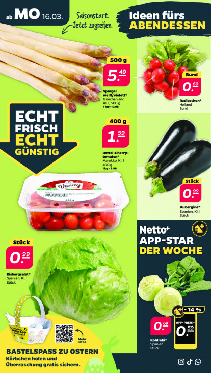 Bitte beachten Sie, dass dieser Text automatisch generiert wird und möglicherweise Fehler enthältDn ab MO 16.03 Ideen fürs N WT 49 je 2 ? O= rn Radieschen’ N Bund Holland ECHT FRISCH 59 Pa di eri VE O= ler" Aubergine’ Spanien, Kl. | Stück Netto*t ea Vie APP-STAR EE] fi EIN RN. SA N N = _ @ g Pd gez 03 N DQ OO AR) \ 7 04 7 meal |APP-PREIS» En [0 Oz Le Kohlrabi Stück EE @Od® .e