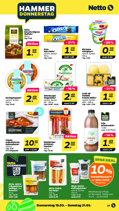 Bitte beachten Sie, dass dieser Text automatisch generiert wird und möglicherweise Fehler enthältNetto © HAMMER DONNERSTAG ighurt ie Feiny Biscuits Mignon Waffeln* 2009 Aimighu of 1Kg=9.95 OSS mn Ee Li Oreo Ehrmann 99 Keks Rolle* Almighurt* &)) versch. Sorten 1? versch. Sorten Of re 1579 1509 1kg=822 1kg=2.60 EU; =>, = Re en Ziegen se er “2 B or \ on: $ É ps ED 2 En U Ziegenrolle enr S À = CHEF DE Altenburger 49 POMME 19 Heringshappen* Ziegenkäse* Frische Klöße* versch. Sorten versch. Sorten versch. Sorten 200g 22 90-1509 400 - 500 g 1kg=12.45 1kg=27.66-16.60 1Kg-2.98- 2.38 EE RK EN à Nn frija “> Schokomilch* S | 1Liter HASENPFANNE ne. zzgl. 0.25 Pfand 1 NS frija Schoko Vogely Milch. Argenti i is: Radeberger Hasenpfanne* 107 Schinken- 12509 knacker* 1= 1kg=8.79 2409 22 F 888 tiefgeküit 1kÿ- 72.46 SPAR DEAL Hot Dogs LI EIGENMARKE adelen Cac mme, Ê. TA Epressa df ROTEN ze oe Snack-Frikadellen en ug me MEAL QUICK Frikadelichen MEAL QUICK es MEAL QUICK Kaffeegetränk* Schwein* Hot Dogs* Nee) 1659 ese 2009 250 ml Rabattabzug erfolgt KE] 1kg=12.45 Te ÉTAT Cu PEU CE] statt 0.75 16.03. - 22.03.2026 2 Q 4 Donnerstag 19.03. - Samstag 21.03.