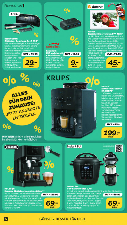 Bitte beachten Sie, dass dieser Text automatisch generiert wird und möglicherweise Fehler enthältREMINGTON (D denver (EN Fr PT x TR CE denver Digitaler Bilderrahmen PFF-1021* % PEST PETE EEE LEICHE INT TO CN und Videos von überall in Sekunden an Glätteisen Geschenk-Set S 350* Familie/Freunde auf diesen Bilder- inkl. hitzebeständiger Aufbewahrungs- EM ElaN Pe el eel tasche, zwei Haarklammern, Styling- screen, vorinstallierte FRAMEO-Soft- speedlink Kamm, ionische Platten mit anti- ware, für Android und Apple/i0S, 16 GB BEER eUT Eur LL Speedlink Speicher, einstellbare Fotowechselzeit eK USB-Verteiler mit 10 Sek. bis 30 Min weniger Hitze- | UvP- 59.99 | 4 Anschlüssen* _ UVP =19.09 | mit Timer (z.B. _ UVP 70.09 | schäden und Frizz, Netzanschluss über nachts ausschalten), 10 Temperatur- USB-C 3.0, 3 x USB zum Hinstellen oder einstellungen von A und 1x USB-C, zur Wandbefesti- 150 bis 230 °C, Kabellänge 0,20 m, EIER Term 15 Sek. Aufheizzeit Farbe Schwarz oder Querformat % KRUPS ofo Jo KRUPS Kaffee-Vollautomat EA810B70* r 1.450 Watt, mit Dreh- regler und Drucktasten, NT as ze schäumdüse, Wasser- Û OST ES behälter 275 g, Kegel- mahlwerk, Tassen- Monte automatisches EE ERIN CET Te ECS automatik = [uvr: 4m | S 0/o HINWEIS: Nicht alle Produkte in allen Märkten erhältlich. re rar ve Re eo hi % EE nr 1 LT U A A | > er LOUE in-1 Multikocher 5,7L* eed es Pr schnell und einfach kochen ohne Herd, viele Gar-Methoden, KELE UC LC Eu ISLE Schnellkochtopf, Reiskocher, Dampf- aufschäumer, 2 Siebe zur Befüllung | UVP = 120.95 | PER EN ef | UVP = 149.09 | METRE ed NUE Tee CE EE CU seitliche Edelstahldüse für bis zu 100 ml speichern, Reis/Pasta 5 Min., Suppe VDE Ey ee Tee TES EAN SEELE EN Weit Lara N Tr Espresso, Macchiato etc.) 1 Liter Wasser- PRA CU IO TS behälter, 100 W maschinenfest)