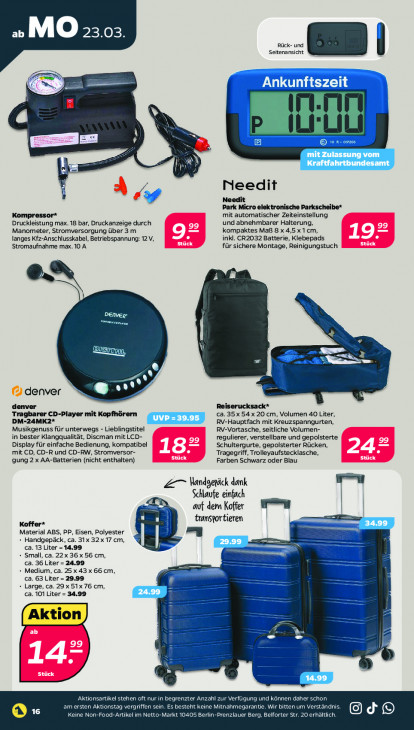 Bitte beachten Sie, dass dieser Text automatisch generiert wird und möglicherweise Fehler enthältb MO 23.03. Rück- und Seitenansicht u | | | >. [== M Needit À ,: Park Micro elektronische Parkscheibe* mit automatischer Zeiteinstellung Druckleistung max. 18 bar, Druckanzeige durch und abnehmbarer Halterung, Manometer, Stromversorgung über 3 m kompaktes Maf 8 x 4,5 x1 cm, 9 ss langes Kfz-Anschlusskabel, Betriebspannung: 12V, Er inkl. CR2032 Batterie, Klebepads Een ‚Stromaufnahme max. 10. A für sichere Montage, Reinigungstuch pa Re CES S Ee \ 4 Kd Ib = @ denver — denver Reiserucksack* Tragbarer CD-Player mit Kopfhörern ca.35x 54 x 20 cm, Volumen 40 Liter, DM-24MK2* RV-Hauptfach mit Kreuzspanngurten, Musikgenuss für unterwegs - Lieblingstitel RV-Vortasche, seitliche Volumen- in bester Klangqualität, Discman mit LCD- regulierer, verstellbare und gepolsterte Display für einfache Bedienung, kompatibel ‚Schultergurte, gepolsterter Rücken, 24° mit CD, CD-R und CD-RW, Stromversor- 18” Er Tragegriff, Trolleyaufstecklasche, BE gung 2 x AA-Batterien (nicht enthalten) Farben Schwarz oder Blau E \andgeräck dank Schlaufe einfach auf dem Koffer || Koffer* | transtortieren Material ABS, PP, Eisen, Polyester - Handgepäck, ca. 31x 32x 17 cm, =. ca. 13 Liter = 14.99 Small, ca. 22 x 36 x 56 cm, ca. 36 Liter = 24.99 Medium, ca. 25 x 43 x 66 cm, ca. 63 Liter = 29.99 Large, ca. 29 x 51x76 cm, B ca. 101 Liter = 34.99 ji —— bd = WE __ & a il — EL Ed Id D 99 Re Va 14 Stück iS ‚Aktionsartikel stehen oft nur in begrenzter Anzahl zur Verfügung und können daher schon 16 am ersten Aktionstag vergriffen sein. Es besteht keine Mitnahmegarantie. Wir bitten um Verständnis. d © Keine Non-Food-Artikel im Netto-Markt 10405 Berlin-Prenzlauer Berg, Belforter Str. 20 erhältlich.