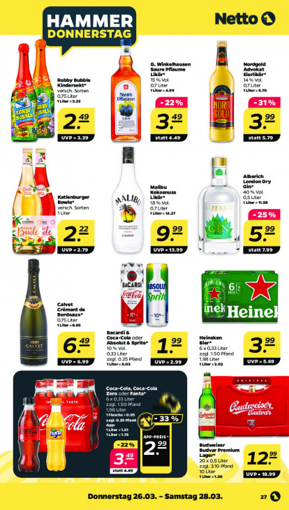 Bitte beachten Sie, dass dieser Text automatisch generiert wird und möglicherweise Fehler enthältNetto © HAMMER DONNERSTAG EA A Ni Saure Pflaume G. Winkelhausen Advokat Nordgold 2 Likôr* Eierlikör* Robby Bubble 15 % Vol 14% Vol Kindersekt* 0,7 Liter 0,7 Liter versch. Sorten ALitor = 4,99 ALiter = 5.70 0,75 Liter a ALiter =3.32 |Pflaume l SS | | U 1 99 h 22 32 LA A = À fer Alberich London Dry I Malibu Gin* 28 Kokosnuss 40 % Vol. Katlenburger Likör* 0,5 Liter Bowle* SALI&, 18 % Vol. 1 Liter = 1.98 versch. Sorten 0,7 Liter BE 1 Liter 1 Litor= 14.27 x 22 uaveur 99 e 92 he ús N EZ WEN fg CARO! Vo a ind, Calvet Crömant de Bordeaux* inek Bü 0 10%- | Heine 1Liter 8.65 0,75 Liter Le kunt = a Bacardi & Coca-Cola oder Hei CALVET 10 % Vol. Absolut & Sprite* 6 x 0,33 Liter 6= 0,33 Liter 12 zzgl. 1.50 Pfand 3 zzgl. 0.25 Pfand 1,98 Liter ET ALiter = 6.03 1 Liter =2.02 ur GER ERP ÉLUS Coca-Cola, Coca-Cola A4 6x 0,33 Liter 1.1.50 Pfand Cd x iter 1Flasch 0.95 ED 25 Pfand AS i App: IEEE a kl @ I ere 51 De APP-PREIS 99 Budweiser Budvar Premium Lager* = 99 { 20 x 0,5 Liter 12 e zzgl. 310 Pfand 10 Liter 1Liter =1.30 Donnerstag 26.03. Samstag 28.03. 2)