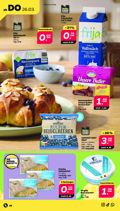 Bitte beachten Sie, dass dieser Text automatisch generiert wird und möglicherweise Fehler enthältab DO 26.03. MARKE Frischmich 7 3,5% Fett* 1Liter Dauertiefpreis ce {ml frija 40%* Speisequark -B 2509 Ja 1Kg=2.76 Ke = ON COTE frija Fett = A speisequark ER = — SACHSEN AIS à li 7 9 ar Le er re ff A: u‘ u Sachsenmilch Unsere Butter Ey streich fein* 2509 1kg=5.96 + y: "1 CES gt Z- IARVESTBEST IEIDELBEEREN EIGEN "20% x Cr se HARVEST BEST Obst* 500 - 750 g versch. Sorten 1kÿ=7.98-5.32 statt 4.99 #68 tiefgekühlt. Auer N uno SS He 1 = id Di 2 Hefewürfel* 3x429 en ner 1Packung = 0.15 1kg=2.38 3 Packungen D — ertiefpreis a 3 Virgilio carpone* 0 g Be £ =1.96 @ ze @Od®