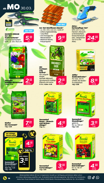 Bitte beachten Sie, dass dieser Text automatisch generiert wird und möglicherweise Fehler enthältab MO 30.03 hd je pe du 5 mel U mn rde en — a a Netto U [3/1371 Fn L MARKE Akku- 4er-Set Holzfliesen Akazie* Gartenpflege-Set* = AÍ GARDEN + ca. 30 x 30 x 2,4 cm = 0,36 m? GPS 3,6 V Li-lon, witterungsbeständig Hecken-/Strauch- GARDEN DREAM rutschfest scherenaufsatz, 2er-Set mit Drainage für Grasscherenauf- Gartenscheren* Wasserablauf 99 satz, integrierter mit ergonomischem Material Akazie, 3,6 V/1,5 Ah Set Griff, ca. 20 x 19,5 cm Polypropylen Akku x Un RD! we = = Sr BOL, VAR) B Rn HOCHBEET- SE Re de Y rs] | ty cn UNI ERDE ae SE En Hochbeet- EN = erde TONFFRE torffrei* mit Langzeit- GIE Allflor 404 dünger, Bodenaktivator* 99 optimale Nährstoff- 99 für max. 25 m?2, LE Plantaflor versorgung für kräftige erhöht die Boden- Qualitäts-Blumenerde* Pflanzen und reiche fruchtbarkeit 1Liter=0.07 Er Ernte, 1Liter = 0.15 20 Liter ETS 1kg=3.60 = | Ê Js CO 2 Baum, G Senne où ES 5 u PA En Dinar Le Vd f F, 3 en 73 u Bi Re 7 r Sonnenhof Sonnenhof Baum-, Strauch- Eisendünger* Bioflor und Hecken- gekörnt, = Bio Hornmehl* 42 für ca. 100 m2 25kg dünger* ET 1kg=3.20 1kg=2.- 1kg=133 EE - De) B 7 Jon lonnenhof. Le À oer Sonnenhof. 99 Rasendünger mit ue ET x U K fl SE = POST 1 a 99 LS ELLE of Rasen, inger* EL Sonnenhof Sonnenhof für 5 m2 32 Beerendünger* 42 App: ES Gartendünger* für ca. 40 m? ALTES FT 1kg=160 2,5kg Ikg=: EELS Aktionsartikel stehen oft nur in begrenzter Anzahl zur Verfügung und können daher schon am ersten Aktionstag vergriffen sein. Es besteht keine Mitnahmegarantie. Wir bitten um Verständnis. [155 Keine Non-Food-Artikel im Netto-Markt 10405 Berlin-Prenzlauer Berg, Belforter Str. 20 erhältlich. @Od®