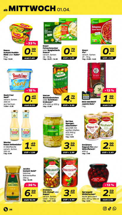 Bitte beachten Sie, dass dieser Text automatisch generiert wird und möglicherweise Fehler enthält» MITTWOCH o:.04 en Zi LT NEL A [23 EN UATTRO Bolognese ere Bestel Kollandaise {ELU ' ER K | 1 N ED, m à Gb En SA 33% Knorr Feinschmecker instant Nudeln Sauce* oder Spaghetteria Fix* Knorr Rind oder Huhn* 0! versch. Sorten O 79 versch. Sorten O= 759 24-559 27-709 1kg=13.20 1Kg 32.91-14.26 1Kg=21.85 - 8.42 Fe u) Ti, ®- Baufz her Jasmin HT Es Ê ’ mittelsch = -18% =13 % Bautz’ner Harzer u Senf* 45 Bockwürstchen rat | 99 versch. Sorten oder Schinken- MARKE 200 ml krakauer* RICE MARKET aus Sachsen ATG 400 9, 650 9 Jasmin Reis* 1Liter=2.25 1Kg=11.98 EED 1kg = de a m Bel Sun Spargel- abschnitte* Würzfleisch} geschält mit Ragout fin Ê #44 weißen Köpfen mietipt yi EE Spatgeläbschnitte ATG 990 9 teen À DES É us) | 1700 ml % SES Ha Ikg=363 me > Werder x Sauce Hollandaise* 59 Dreistern 99 in Glasflasche 12 Ragout Fin oder versch. Sorten Würzfleisch* 250 ml KE 400 g 1k9= 5.96 1Kg=7.48 one CD) Jacobs Instant Gold* OMATENSUPPÉ löslicher a Bohnenkaffee Ja, 2009 EN Ikg=24.95 tre JACOBS LS un EL 99 Dreistern XXL Eintopf oder eegold e Suppe* versch. Sorten 32 Süßkirschen* 22 1200 - 12309 ATG 290 g, 580 ml leicht gezuckert = 1kg=291-284 1Kg-8.93 EEE © ze Od©