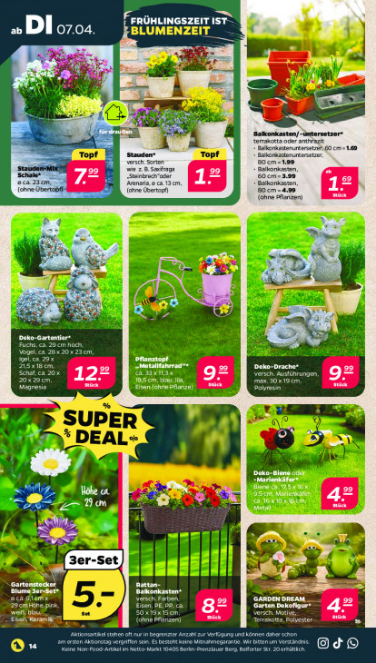 Bitte beachten Sie, dass dieser Text automatisch generiert wird und möglicherweise Fehler enthältFE. FRÜHLINGSZEIT IST— E ab DI 07.04 Il. ir %. ee " D Est À ed fi) BE ee né En SAP Ke Fn a. a ce His % ue 5) Balkonkasten/-ùntersetzer* terrakotta oder anthrazit el Balkonkastenuntersetzer,,60 cm = Stauden* Balkonkastenuntersetzer, = versch: Sorten 80 cm .99 Stauden-MbiRE Balkonkasten, Schale* EE wie z. B. Saxifraga 99 „Steinbrech“oder 60 cm=3.99 o ca. 23cm, Arenaria, o ca.13 cm, Balkonkasten, (ohne Übertoßf] (ohne Übertopf) 80cm=4.99 Pr Stück (ohne Pflanzen) A € = * ZES > Ge 5 en D akk + / ® 8 pn 33 Da Pe es N A an a Hs Deko-Gartentier* à 3% Lee Tan ater Vogel, ca. 28 x 20 x 23 cm, Igel, ca. 29 x Pflanztopf 21,5 x18 cm, ,Metallfahrrad“* Deko-Drache* 99 EEE ca. 33 x11,3x NEE ee Pon re 19,5 cm, blau, lila, max. 30x19 cm, Magnesia Er Eisen (ohne Pflanze) Eens Polyresin ne, K\ À fr © DA | e u > 77 Deko-Biene oder. -Marienkäfer* Biené ca. 175 x16 X 99 P EREN ks KERA iel Es oa Ran Ze Dem 3° Metal Er N \ Pfser-set) — dg Gartenstecker Rattan- = — _ Blume 3er-Set* Balkonkasten* oca.6,lemx NEE EN GARDEN DREAM RDS Eisen, PE, PP, ca. 99 C3 Garten Dekofigur* weif, blau, 50 x19x15 cm, Stück KN ET ECC CUS (ohne Pflanzen) LCI RCE EVE | stehen oft nur in begrenzter Anzahl zur Verfügung und können daher schon 14 am ersten Aktionstag vergriffen sein. Es besteht keine Mitnahmegarantie. Wir bitten um Verständhnis. © d © Keine Non-Food-Artikel im Netto-Markt 10405 Berlin-Prenzlauer Berg, Belforter Str. 20 erhältlich.