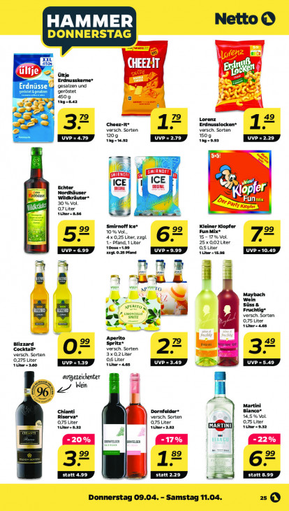 Bitte beachten Sie, dass dieser Text automatisch generiert wird und möglicherweise Fehler enthältHAMMER Netto © DONNERSTAG A ED XXL 14 4500 en N nt eu lij KW VN {rs I Ültje Erdnusskerne* 3? 4 gesalzen und a gerös CUT Fe geröstet 2 4509 1Kg=8.42 79 - Cheez-it* Lorenz Erdnusslocken* 3 79 versch. Sorten versch. Sorten 12 1209 1509 1kg=4.02 1Kg=9.93 bu) iz We, Echter ICE Nordhäuser ORIGINAL topfer Wildkräuter* 30 % Vol. me 0,7 Liter re Party u si ALiter = 8.56 | 10 % Vol. Smirnoff ice* Fun Mix* Kleiner Klopfer 4x 0,25 Liter, zzgl. 15-17 % Vol D= 1.- Pfand, 1Liter 6° 25 x 0,02 Liter 7= Dose =1.99 0,5 Liter zzgl. 0.25 Pfand 1 Liter =15.98 a > nem Pr! een, un _Æ ä ie m vee vu o PTO Wein Maybach Süss& (ri) . Fruchtig* à versch. Sorten 8 as 1 Litor= 4.65 0,75 Liter = Aperito Blizzard Spritz* Cocktail* versch. Sorten versch. Sorten O= 3x 0,2Liter 22 32 0,275 Liter 1 Litor = 4.65 06 Liter 1 Liter = 3.60 EED =, ausgezeichenter Zu, 2’ Wein ra Martini Chianti Dornfelder* Bianco* Riserva* versch. Sorten 14,5 % Vol. “gel ALiter = 5.32 0,75 Liter 1Liter=2.52 0,75 Liter 1 Liter = 9.32 0,75 Liter BIANGD DORWFELLER | 32 12 6° Donnerstag 09.04. Samstag 11.04. 5: ©
