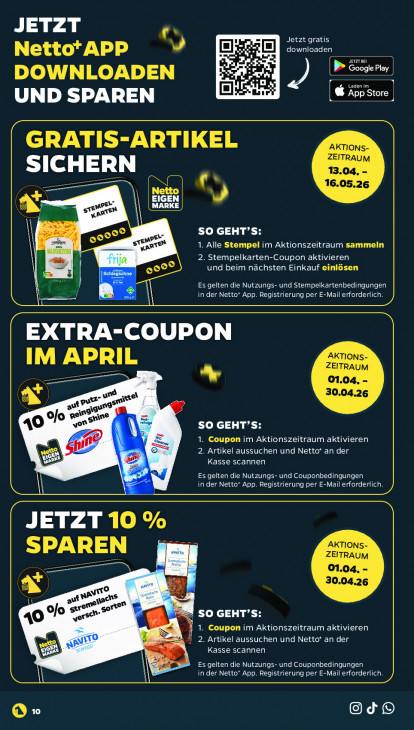 Bitte beachten Sie, dass dieser Text automatisch generiert wird und möglicherweise Fehler enthältJETZT Cor Jetzt gratis Netto*APP I downloaden mt] > Google Play DOWNLOADEN LES À Li UND SPAREN & App Store Ì à GRATIS-ARTIKEL AKTIONS- ZEITRAUM SICHERN 13.04. ol 16.05.26 EIGEN Ÿ sn wen SO GEHT’S: EL gren? zen 1. Alle Stempel im Aktionszeitraum sammeln Sr 2. Stempelkarten-Coupon aktivieren und beim nächsten Einkauf einlösen ps Es gelten die Nutzungs- und Stempelkartenbedingungen in der Netto* App. Registrierung per E-Mail erforderlich D N EXTRA-COUPON IM APRIL AKTIONS- ZEITRAUM 01.04. 30.04.26 wu u wite SO GEHT’S: 40 ofo vend de 1. Coupon im Aktionszeitraum aktivieren 2. Artikel aussuchen und Netto* an der Kasse scannen he La Es gelten die Nutzungs- und Couponbedingungen in der Netto‘ App. Registrierung per E-Mail erforderlich 5 SN JETZT 10 % AKTIONS- SPAREN ZEITRAUM 01.04. 30.04.26 EN ve Seret so en - verst 40 % A. N so GEHT'S: 1. Coupon im Aktionszeitraum aktivieren {| 2. Artikel aussuchen und Netto’ an der Kasse scannen Es gelten die Nutzungs- und Couponbedingungen a DES, @Od® &»
