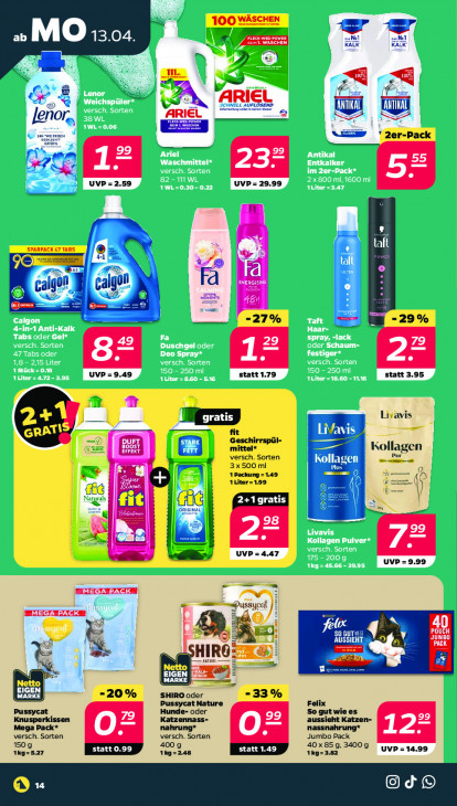 Bitte beachten Sie, dass dieser Text automatisch generiert wird und möglicherweise Fehler enthältEN 100 ab MO 13.04 Nel VAE] KALK KAIK N = ai | “a € =. L ARIEL fd jen Of x wu = "2 ack DK? = Se fi — UVP=2.59 UVP = 29.99 à SPARPACK 47 TARS taft 79 id ENERGISING calgon Calgon HE “27% 9% UVP = 9.49 statt 1.79 statt 3.95 Livavis fit LiVavis Exed QT Geschirrspül- mittel“ ze Ei 2 versch. Sorten Kollagen ur À 3x500 ml Kollagen Plus une Zt 1 Packung = 149 % it a, Aliter=1.99 (CL Ö Lid | Kil 205 ORIGINAL, 2+1 gratis © 22 LS 7= UVP= 4.47 UVP = 9.99 MEGA PACK Dussyedt ] EI: fe S0 GUT: POUCH JUNEO SSHIRG mat 6 EEn EE EL =20 % SHIRO oder "33% Pussycat Nature Felix Hunde- oder Katzennass- So gutwiees aussieht Katzen- Mega Pack* ereen nahrung* nassnahrung* versch. Sorten O2 versch. Sorten Jumbo Pack 1509 statt 0.99 400 g statt 1.49 40x85 9, 3400 g UVP=14.99 1Kg=5.27 1kg=248 1kg=3.82