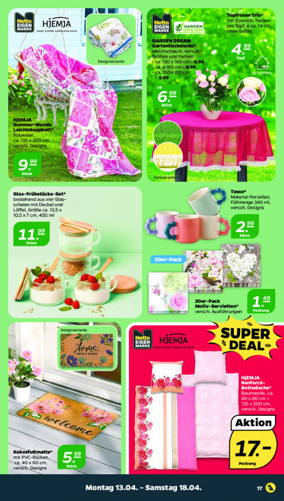 Bitte beachten Sie, dass dieser Text automatisch generiert wird und möglicherweise Fehler enthältpu: Trio* mit 3 versch. Farben IGEN HJEMJA EIGEN Sf GARDEN Pro Topf, 0 ca.14 cm, Ganz schön ausarscnLaren. “ MARKE ‚ohne Gefäß $ GARDEN DREAM SEN 6 Weichschaum, verschi A =) ‘Größen und Farben 4 AA Designarlante ca. 130 x 160 cm-=6.99, cà.0 160 cm=8:99 ca.150x 210cm Le à N N =9.99 . re | AC IE AL Rek * ZN S aM sw Le NN Bn) mees IV. En HjEMJA ÿ Sommer-Wende. Leichtsteppbett*. K Polyester, ca. 135 x 200 cm; Re Er erscl & 2 4 Ni > A8 We ® RER WE 2 Glas-Frühstücks-Set* Tasse* Material Porzellan, bestehend aus vier Glas- Füllmenge 340 ml, schalen mit Deckel und versch. Designs Löffel, Größe ca. 13,5 x 10,5x7 cm, 450 ml eu © ij SS Da #7 & NN Ÿ jr 41] N ® Ei EN /j + À LD ge} ré = Dj m Pack Se Moti ‘Servietten* versch. Ausführungen —— u um Ya mr, 4 Dern TS NW 1 SUPER EIGEN \MARKE ) » DEAL+ | Ve, bi 2 3 EL HjEMJA ref ne Renforcé- Bettwäsche* Baumwolle, ca. u 80x8& 135 x 200 cm, ER BE & NE PAC EC FE ES Fa © 5 e 2 Kokosfußmatte* mit PVC-Rücken, 17- ca. 40 x 60 cm, | Packung versch. jesigns IS Montag 13.04. - Samstag 18.04. &