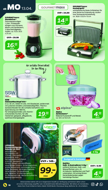 Bitte beachten Sie, dass dieser Text automatisch generiert wird und möglicherweise Fehler enthältGOURMETmaxx GOURMETMAXX ab MO 13.04. Kontaktgrill* antihaftbeschichtete Grillplatten für eine fettarme Zubereitung, stufen- UVP =34.99 lose Temperatureinstellung, ca. 26,8 x 22,9x13cm GOURMETmaxx Standmixer* Fassungsvermögen 1Liter, 4 Edelstahl- nn klingen zum Pürieren, Mixen und Zerkleinern, 2 Geschwindigkeits- I | | | | | |] stufen, ca. 17,5 x 37,5 | | I IE | |) x21cm | | N | | | | I) 5 UVP = 39, || El Li il I | IN a ES Sa un En re (A der gerfekte Universattorf == 5 für den = NY 7 > \ A JE S are gun ince 19 8 Fos en — SSW bel A x 8 Edelstahikochtopf XXL* 9 ca. 26 cm, Inhalt 10 Liter, mit Glasdeckel, seidenmatt a N mit polierten Streifen und Edelstahlgriffen, Thermo- Sandwichboden für die schnelle Aufnahme und A € alpina° Speicherung von Wärme, für energiesparendes und vitamin- Alpin: schonendes Kochen, für alle Zerkleinerer* Herdarten geeignet, pflegeleicht, Material Kunststoff und Metall, spülmaschinengeeignet ca.9,5x012,5cm D je Ft, en LIFENAXX à mn Lee ungs- En Roboter L) 55* N automätisches Sprühsystem mit Ce x 2 Düseh, 3Reinigungs- EEG uut Nateers hwindigkeit ET ‚ geeignet für Fenster, Spiegel und Wandfliesen, Rokitta zuverlässiges Abstuı EEE Kalk- & Rostradierer 2-tig.* UVP=9.99 entfernt Schmutz, Kalk- und großer Wassertan] extra langes Strom- CR ed bel, MCE CC) Wasserflecken von z. B. El seil, Fernbedienung Armaturen, Spülbecken und Topf- (inkl. Batterie) o a Reinigungstuch, 99 Unterseiten, mit winzig feinen PRE EA DEEE dE Stück Keramikelementen gegen ECM EC) hartnäckige Flecken Aktionsarti en oft nur in begrenzter An: a ur COTTON LOUE r schon amer en Aktio jergriffen sein. TT TN [A ES Non-Foo; Arti | im Netto-Markt 10405 in-Prenzl Ad: Iforter EL Scan d ©