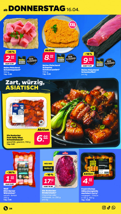 Bitte beachten Sie, dass dieser Text automatisch generiert wird und möglicherweise Fehler enthält» DONNERSTAG 16.04 — nm er A N Hp il À EN jj | kes à 4 Aktion TN pe Ee > a Ei ( à Zin z ae te) 8° = Ba A) Meine Fleischerei (MARKE | LOT nr Schwei Schweinegulasch* 900 g Schnitzel paniert* Meine ee LT 5009 5.98 1kg=9.99 ETS) Zart, würzi ASIATISCH ay GE al nd Dd DE) R F7 EN A PE Bi j; > Pz f ZE > Aktion Die Rostocke Pork Belly Bites Schweinebauch* Rn 9.51 it, gewürzt, 700 g GEL = LE ae se “ EE ! us CHEN HÄHN NEU BEI SPIESSE E; eu) CURE a "26% STEHEN! =10 % Aktion 99 8 statt 2.69 trés 42 statt 19.99 Wolf 2 in Fresh Kitchen Mini Berner Hähnchenspieße Würstchen* mariniert Curry* ME vorgegart, 3 Stück 250g 4120 g,360g LL =7.96 1kg=13.86 [A E7 @Od®