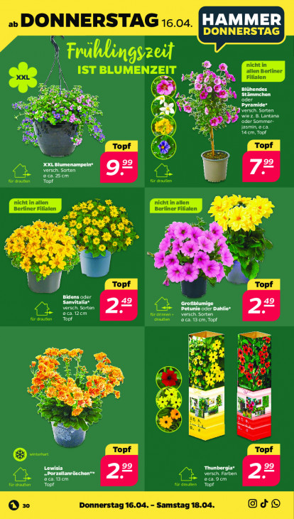Bitte beachten Sie, dass dieser Text automatisch generiert wird und möglicherweise Fehler enthält» DONNERSTAG :5.04. LU LU 1] DONNERSTAG à UT N nicht | N h IST BLUMENZEIT all Berliner I ed Filialen Blühendes Stämmchen a CES = NEE Ch Pyramide* = à Æ En wiez. B. Lantana X oder Sommer- 6D, jasmin, o ca. © à 14cm, Topf Hil EN zeer | ii XXL Blumenampeln* 99 ME hu 9 ca. 25cm LENS für draugen LC nicht in allen Fe ok: Berliner ialen > ws Er ar & EM DE + + f + TE À? ES À ok 9 x y > % [_ Topf | Bidens oder Sanvitalia* Grofblumige versch. Sorten oca.12cm 22 GG Petunie oder Dahlie* = für draußen Ko für drinnen + CET ME re ca. 13 cm, Topf Rn N Cn AD, x ne [7 ‘ er a De Lu à NP 5 AM GD un #9? He He = 3, R À WE LS N ï ; Fe 5 Ke, M © Lewisia „Porzellanröschen“* LOUE ES versch. Farben en ca.13 cm Vin oca.9cm 2 een) cd een Topf Donnersta: Samstag Od
