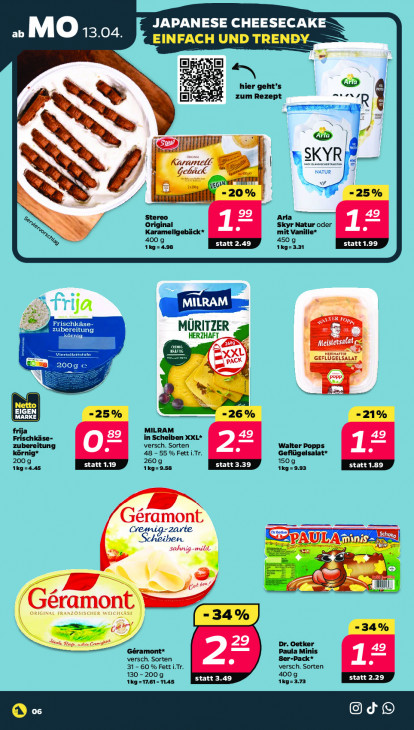 Bitte beachten Sie, dass dieser Text automatisch generiert wird und möglicherweise Fehler enthältJAPANESE CHEESECAK ab MO 13.04 EINFACH UND TRE mg EAA hier geht’s zum Rezept = u SR TEE re Karamell 3 N Gebäck zang ds "20% "25% Stereo Arla Ve RN Original Skyr Natur oder Karameligebäck* 12 mit Vanille* 12 %, 400 g statt 2.49 450 g BAE) 1Kg-4.98 1Kg-2.31 set ube MURITZER di RE HERZHAFT m) Liu 210 | Cru GE! à © d ME Es A EIGEN "25% TE "26% "21% ELT frij MILRAM Frischkäse- in Scheiben XXL* zubereitung O> versch. Sorten 48 - 55 % Fett i.Tr. 2= Walter Popps ES 200 g körnig* 2609 1509 Geflügelsalat* 1Kg=4.45 statt 1.19 1Kg=9.58 statt 3.39 1Kg-9.93 statt 1.89 Géramont -2ar: LE] Pen sahnig-mild = MIN AB (Gé ramont 34 (-34% ) ———— Le) “34% Ai z . amt Géramont* 29 Dr. Oetker Paula Minis versch. Sorten 8er-Pack* 31-60 % Fett i.Tr. versch. Sorten 12 13 2009 statt 3.49 4009 statt 2.29 1 1761-1145 1Kg=3.73 & os