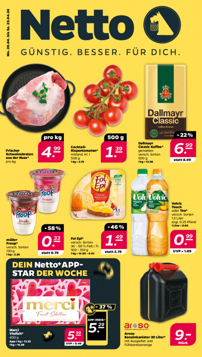 Bitte beachten Sie, dass dieser Text automatisch generiert wird und möglicherweise Fehler enthältRa Netto Mo. 20.04. bis Sa. 25.04.26 GUNSTIG. BESSER. FUR DICH w NP Kr Fl en. > i iel à ayr SSIC « w na Dallmayr Cocktail- Classic Kaffee* Frischer Schweinebraten Holland, KI. | Rispentomaten* versch. Sorten gemahlen Jens aus der Nuss* 42 500 g ES 500 g pro kg 1kg=2.78 1Kg=13.98 h d ve a I Volvic > N 3 Touch versch. Sorten oder Tee* Aa 1,5 Liter zzgl. 0.25 Pfand ALiter = 0.66 müller 33 Fol Epi* 49 Froop* versch. Sorten O= versch. Sorten 36 - 50 % Fett i.Tr. à 1509 1kg=2.20 100-1509 1kg = 14.90 -9.93 de me DEIN DER WOCHE Ne VIE y 2% 14 be pe ame CI De Drm Aroso a Benzinkanister 20 Liter* Füllstandsanzeige mit Ausgießer und Bit