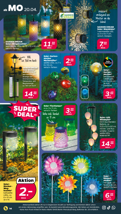 Bitte beachten Sie, dass dieser Text automatisch generiert wird und möglicherweise Fehler enthältN "4 b N a ab MO KON 1% Pe = dr GARDEN É umliegend ein Zr 1 ON (A - x N INAS 14 ni IX) EA & Ee RS N = & = 7 N Wand IN nm AAD RAN) A AL A =: NX) {X} oc IN) 4 N E => > GARDEN DREAM 10 I IN) IN) Bo Qi " = Solar-Wanddeko* N N 7 KE EEK) (à k WZ ca.9x9x7 cm, ny "| jl MN) GARDEN DREAM - a Solaı ingeleuchte* EEJ warm MO x 10 x 22 ji iGe LEDs, Stück Li Stück EE tel EL ù A Solar-Garten- XXL a. 1,60 m hoch Marienkäfer* rb- RENE eeN x Ee NE wechsel 6x14cm, El = De PTE CURE tre] (BN, Garten- warı stecker* Anzeige den à > mitGlasball, Tr ae LLC TX Le aie) DRE TU Regenmenge, op: LETTRES > [fe ud ee} N > Edelstal A Per) 0 Be) 14° = Si 32 Stück ET mm \ % Solar-Tischlampe* oca.9x1cm, PN versch. Farben 99 SUPER! TUE CE Sack * DEAL*+ a. 11 cm Solar-LED Windspiel* DEEE EU Ballons, ca. mr W 12,5x12,5x82cm, + . du mit An- und Aus- schalter, 5 warm- weife LEDS, » vr Material PP À # D jy Op 99 N D LR à Stück Le ar à 4: Fa 4 Y FB x 1 u EN EN Le LS à 5 + PS = LP? Solar- 7 Blumen- Se à, + VA Sola A LOT Steckel St 16x6x76 cm, Weg- En De a Farben leuchte* kaltweiße LEDs, ca. u 6” 6x31cm Stück Stück (oxH) Les Aktionsartikel stehen oft nur in begrenzter Anzahl zur Verfügung und können daher a ‚am ersten Aktionstag vergriffen sein. Es besteht keine Mitnahmegarantie. Wir bitten um Verständnis. © d © (AE Keine Non-Food-Artikel im Netto-Markt 10405 Berlin-Prenzlauer Berg, Belforter Str. 20 erhältlich.