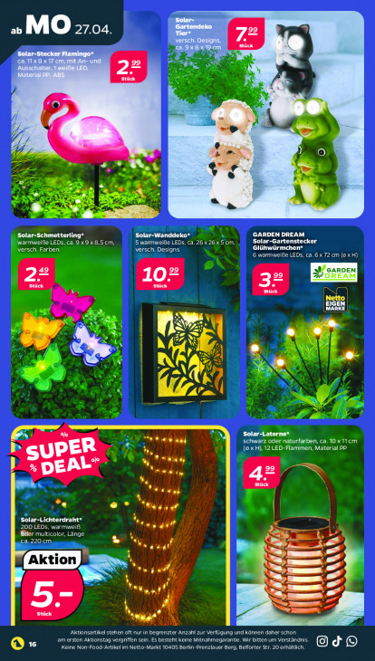 Bitte beachten Sie, dass dieser Text automatisch generiert wird und möglicherweise Fehler enthältEbi Gartendeko ab MO 27.04. Kiel | ca.9x8x19cm Solar-Stecker Flamingo* | D ca.nx8x 75, k R (7, 5 e\ x Bi Be eh: en AS 4 ke en S | 2 DS PE Solar-Schmetterling* Solar-Wanddeko* GARDEN DREAM warmweie LEDs, ca. 9 x 9 x 8,5 cm, 5 warmweiße LEDs, ca. 26x26x5 cm, Solar-Gartenstecker NÉE LCL MEt Glühwürmchen* 6 warmweiBe LEDs, ca. 6 x 72 cm (0 x H) 9 GARDEN Netto IARKE IGEN ES 6 ds NL ZA = e x 5 179, a + (7 WZ > & « NS: 4] R PU a on 2 7” Solar-Laterne* an al 1 EN schwarz oder naturfarben, ca. 10x 11cm (0x H), 12 LED-Flammen, Material PP u 2 FN: 4 Ma ar. LC it: (of Solar-Lichterdraht* 8 200 LEDs, warmweif brad 6er multicolor, Länge # a me ca. 220 cm hi 9 & x À <= Aj md NN 2 & ums, WR a le Zi Lig le: es zu B 4 ; À ‚Aktionsartikel stehen oft nur in begrenzter Anzahl zur Verfügung und können daher schon am ersten Aktionstag vergriffen sein. Es besteht keine Mitnahmegarantie. Wir bitten um Verständnis. d © © Keine Non-Food-Artikel im Netto-Markt 10405 Berlin-Prenzlauer Berg, Belforter Str. 20 erhältlich.