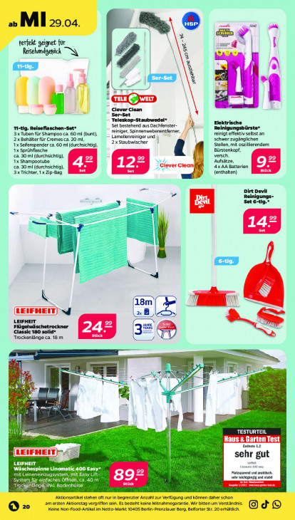 Bitte beachten Sie, dass dieser Text automatisch generiert wird und möglicherweise Fehler enthältab MI 29.04 vee 2 terfekt geignet für #4 u Reisehandgepäck TN Ser- & A 2: = ’ Clever Clean 5er-Set Teleskop-Staubwedel* Set bestehend aus Dachfenster- Elektrische TI-tig. Reiseflaschen-Set* reiniger, Spinnenwebenentferner, 1 Reini ürste* 3 x Tuben für Shampoo ca. 60 ml (bunt), reinigt effektiv selbst an 2x Behälter für Cremes ca. 20 ml, Lamellenreiniger und | \ schwer zugänglichen 1x Seifenspender ca. 60 ml (durchsichtig), 2x Staubwischer Stellen, mit oszillierendem 1x Sprühflasche Bürstenkopf, versch. ca. 30 mi (durchsichtig), Aufsätze, 1x Shampootube 42 12° : ca. 30 ml (durchsichtig), set Set 4x AA Batterien 3x Trichter, 1x Zip-Bag (enthalten) = > £ Dirt Devil = Reinig; Set 6-tig.* = n° —— Re MR n =. Set K 5 KN 18m PAUL GEIFHEIT) 4 2 B 5 LEIFHEIT JRE Classic 180 solid* Flügelwäschetrockner 24° Ser CE Trockenlänge ca. 18m ® — —— M == m et As Ne ij = g! 8 à | — h BT x 5 = a ki TESTURTEIL N Haus 8 Garten Test Endnote 1,2 sehr gut LEIFHEIT Leineit Ainanatie 400 sy Wäschespinne Linomatic 400 Easy* Platzsparend und praktisch, SEELE RER EEE 892 sehr leichtgängig und stabil System für einfaches Offnen, ca, 40 m EE Trodı led aeta PTE TRE joues Aktionsartikel stehen oft nur in begrenzter Anzahl zur Verfügung und können daher schon ‚am ersten Aktionstag vergriffen sein. Es besteht keine Mitnahmegarantie. Wir bitten um Verständnis. Ed O= Keine Non-Food-Artikel im Netto-Markt 10405 Berlin-Prenzlauer Berg, Belforter Str. 20 erhältlich.