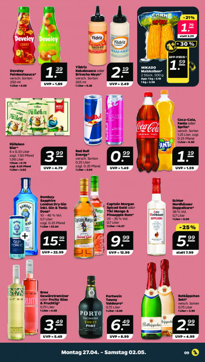 Bitte beachten Sie, dass dieser Text automatisch generiert wird und möglicherweise Fehler enthält= CORNI u Ro > dd Gs a: # & À Ng Yildriz, AA otiesch Yild nn KBap SAUC) GE |APP-PREIS» | > = — 59 Yildriz MIKADO Develey Kebabsauce oder Maiskolben* Feinkostsauce* Sriracha Mayo* 2 Stü versch. Sorten versch. Sorten 2: 500 g 218 250 ml 265 ml KL App: 1k 23.58 1Liter =5.56 UVP =1.89 1 Liter = 8.26 UVP= 2.49 > 4 7 nn = — zZ EE — En & filles — Pi nr Püllefion RY > a ki Coca-Cola, ei $ R Fanta oder 1 à Sprite* 7 versch. Sorten À DS ne 1,25 Liter, zzgl. 0.25 Pfand ES 1Liter=0.95 Pülleken Bier* Red Bull 6x 0,33 Liter zzgl. 1.50 Pfand Energy* 1,98 Liter 3? versch. Sorten 1Dose =0.75 0,25 Liter A zzgl. 0.25 Pfand UVP=4.79 zzgl. 0.25 Pfand UVP =1.49 UVP =1.59 Aliter=- 2.02 1 Liter = 3,96 vak E © A Bombay De Sapphire Echter London Dry Gin Nordhäuser MB inkl. Gin & Tonic 2 a 3 ) Captain Morgan Spiced Gold oder Doppelkorn* Dose* ul Tiki Mango & cr 38 % Vol. 10 - 40 % Vol. Pineapple Rum* ordhäuser 0,7 Liter 0,7 Liter 25 - 35 % Vol. ALiter = 8.56 ain Mora > 0,7 Liter Een 1 Litor =22.84 zzgl. 0.25 Pfand 8 1Liter =14.27 = aa a "25% m 4 oi ddie en Bi eol LE UVP = 22.99 au = UVP = 12.99 == statt 7.99 rs = \ Ll = { — 5] SUR = = Bree Gewürztraminer Portwein oder Fruity Süss Tawny Sa en & Fruchtig* 5 Valdouro* versch. Sorten 0,75 Liter 0,75 Liter 0,75 Liter 1 Liter =4.65 1Liter =8.65 ALiter = 3,99 PORTO DOURO In iv) 6= he DE Ws, ei UVP=5.49 UvP =8.99 u à UVP = 4.99 Montag 27.04. - Samstag 02.05. o ©