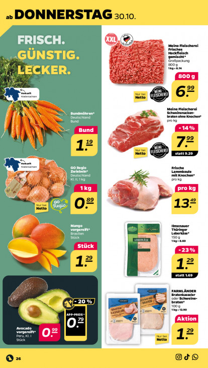 Bitte beachten Sie, dass dieser Text automatisch generiert wird und möglicherweise Fehler enthält» DONNERSTAG 30:0. #3 A) 6 2 Meine Fleischerei Frisches Hackfleisch 5 gemischt* 0 Großpackung Vg 8009 6d 1Kg=8.74 Eu B EET = IE, B DY Herkunft Nur bei Niedersachsen ASCHEI 6” 5 Meine Fleischerei + Gn Schweinenacken- I braten ohne Knochen* prokg \! 19 7° Nur bei Netto I) Herkunft Niedersachsen Frische Lammkeule mit Knochen* prokg de EN #, ke CECA LA 89 Nur bei 13: Netto Iimenauer 7 Thüringer Leberkäse* 1509 1kg=8.60 29 12 4 ED FARMLÄNDER Bratenkasseler re oder Schweine- ei NT braten* CE er 1009 1kg=12.90 |APP-PREIS » woe Ò 79 wa CET] Avocado vorgereift* Peru, KI. 1 0? Stück © ze @Od®