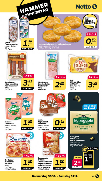 Bitte beachten Sie, dass dieser Text automatisch generiert wird und möglicherweise Fehler enthältNetto © MM led ETS NERS an DIE SELL) 4 MENGE MACHT’S E ra ER D 99 Lysell Feinmarinaden* we 08 versch. Sorten statt 0.95 1259 1kg= 15.92 Em 4 mt (er) sien EEN 77 | FE 7% X us S 49 Arla Radeberger Käse- oder Rind- Stockmeyer Hauchschnitt im Stück* Billinge Käse fleischknacker* Sortiment* 22 26 % Fett i.Tr. 240 9 1259 500g 3? 1Kg=14.54 1Kg=18.32 1Kg=7.98 * 4 ee max. 3 Stück ts pro Einkauf wen wer = rt Pan, 1 En Manner müller Crunchies* der Ecke* Joghurt mit AE = ra versch. Sorten versch. Sorten 1309 140-1509 ORIGINAL IRISCHE BUTTER 1Kg=15.31 1kg=3.50- 3.27 = Con) x Etn Ristorante D D Butter oder Butter im Becher* à DES Poe og DU 196 ET 8.76 mms CVS = > APP-PREIS » Coppenrath -45% 99 Dr. Oetker 99 & Wiese Unsere Goldstücke Salame* Ristorante kemnig und kräftig 3209 6 Dinkelbrötchen* 17 1kg= 6.22 420 9, 1kg=4.74 statt 3.99 #68 tiefgekühlt #68 tefgekühlt EED Donnerstag 30.10. - Samstag 01.11. zz