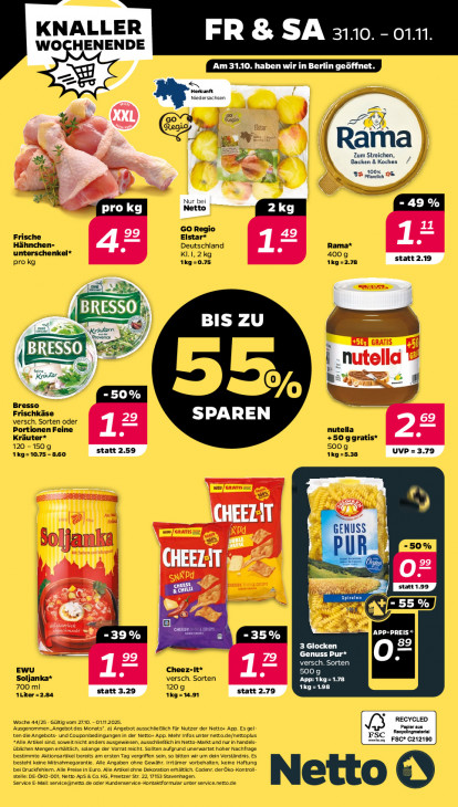 Bitte beachten Sie, dass dieser Text automatisch generiert wird und möglicherweise Fehler enthältal N = 7 \ @ Sue Regio, 4 # _ + eN 4 I Fr Sa Ed 2 1e mr % 4 | zE) GO Regio E Frische Elstar* Hähnchen- Deutschland Rama* unterschenkel* KIL, 2 kg 1° 4009 prokg 1Kg=0.75 1Kg=2.78 a r F =) 2a ki 2 utelld 78 x 4 ER Bresso Frischkäse 29 versch. Sorten oder Portionen Feine nutella 28 Kräuter* +50 ggratis* 120 -150 g 500 g 1kg=10.75 - 8.60 1kg=5.38 Ta —— > ID = za al Tr or JO) le LL -50% a $ (0332, is ib. Oz a 2%, + ke © CNE, En “ie AS EWU JE Cheez-It* 12 Soljanka* versch. Sorten 700 ml 1209 ALiter =2.84 1Kg=14.91 Woche 44/25 - Gültig vom 27:10. - 01.2025. Ausgenommen „Angebot.des Monats". a) Angebot ausschließlich für Nutzer der Netto App. Es gel- ten die Angebots- und Couponbedingungen in der Netto: App. Mehr Infos unter netto.de/nettoplus “Alle Artikel sind, soweitnicht anders ausgewiesen, ausschließlich im Netto-Marktund nur in handels- Üblichen Mengen erhältlich, solange der Vorrat reicht. Sallten aufgrund unerwartet hoher Nachfrage bestimmte Aktionsartikel bereits am ersten Tag vergriffen sein, so bitten wir um dein Verständnis. Es bei Druckfehlern. Alle Preise in Euro. Alle Artikel ohne Dekoration erhältlich. Codenr. der Öko-Kontrall- besteht keine Mitnahmegarantie. Alle Angaben ohne Gewähr. Irrtümer vorbehalten, keine Haftung stelle: DE-ÖKO-001, Netto ApS & Co.KG, Preetzer Str. 22, 17153 Stavenhagen. Service E-Mail [email protected] oder Kundenservice-Kontaktformular unter service netto de. Netto ©