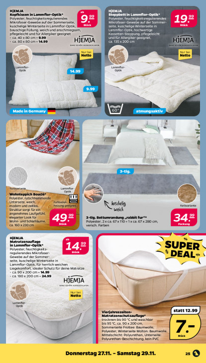 Bitte beachten Sie, dass dieser Text automatisch generiert wird und möglicherweise Fehler enthältHjEMJA DIN Kopfkissen in Lammflor-Optik* Steppbett in Lammflor-Optik* 99 Polyester, feuchtigkeitsregulierendes Polyester, feuchtigkeitsregulierendes Mikrofaser-Gewebe auf der Sommerseite, 92 Mikrofaser-Gewebe auf der Sommer- 19 kuschelige Winterseite in Lammflor-Optik, Er seite, kuschelige Winterseite in Er: bauschige Füllung, weich und anschmiegsam, ELI EEE pflegeleicht und für Allergiker geeignet ES Kassetten-Steppung, pflegeleicht ca. 40 x 80 cm = 9.99 und für Allergiker geeignet, ca. 80 x 80 cm = 14.99 HJEMJA ca. 135 x 200 cm Anz scnow avsaescnLaren. Nur bei Netto Lammflor- Lammflor- Optik Optik u ie ns rx al; = Jd LE 4 Fi: / \ D. A T ER = 2 ze ent, 6 Lammflor: A zh Drarbvariante fi er a ra Optik le SW, Whtiohnteppich Boud y? 7 Polyester, rutschhemmende Zoom) © Unterseite, weich, 4 Fußboden- > = modern und zeitlos, heizu ‚geeignet Schelig Farbvariante % Struktur sorgt für ein weich angenehmes Laufgefühl, "eleganter Look für 3-tig. Bettumrandung „rabbit fur“* 49 34° Wohn- und Schlafräume, stück Polyester, 2 x ca. 67 x 110 +1 x ca. 67 x 280 cm, CT ca. 160 x 230 cm — versch. Farben m HEMJA en Matratzenauflage er in Lammflor-Optik* Polyester, feuchtigkeits- 14° = SUPER regulierendes Mikrofaser- Stück Gewebe auf der Sommer- SS DEAL» à seite, kuschelige Winterseite in Lammflor-Optik, für herrlich weichen Liegekomfort, idealer Schutz für deine Matratze + ca. 90 x 200 cm = 14.99 ca. 180 x 200 cm = 24.99 — HJEMJA Anz SENBN AUSGESENLAFEN. N Nur bei Netto Lammflor- ee Optik -_ rjahreszeiten- = statt 12.99 Matratzenschutzauflage* trocknen bis 90 °C und waschbar — / bis 95 °C, ca. 90 x 200 cm, >» Sommerseite Frottee: Baumwolle, Polyester, Winterseite Molton: Baumwolle, 7- Mittelschicht: Polyurethan, Unterseite: Stück Polyurethan-Beschichtung, kein PVC Donnerstag 27.11. - Samstag 29.11. 23 ©