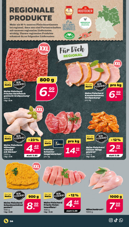 Bitte beachten Sie, dass dieser Text automatisch generiert wird und möglicherweise Fehler enthältREGIONALE Ke M PRODUKTE MÄRKISCHE Mehr als 80 % unseres Fleischsortiments cer loer Gentaeror Sars istregional, denn uns sind Partnerschaften mit unseren regionalen Lieferanten SECHEELD wichtig. Unsere regionalen Produkte 9 TS erkennst du an folgenden Lieferanten: EP A e r Dich, REGIONAL ge es IN | 800 g Nur bei ZEN NE Netto (SCHEREN Nur bei Netto prokg HE Fleische: Frisches Hackfleisch dadel ke ed Kasselerkoteletts 8009 Er ETC pro kg ES wi ) ZR (EIN ‚MEREI Netto "23% GI Hähnchen- Meine Fleischerei schenkel CE Chicken Wings mit Rücken* ET 5 gewürzt* ro magerbäckchen* cop 1kg= 374 statt 5.85 CN) ed 4 À F rt f en) Nur bei Nur bei =12 % Netto Kal 9009 Netto EU 1000 g Meine Fleischei Meine Fleischerei Schweineschnitzel Frische Puten- paniert* innenfilets* 900 g 4009 Hähnchenbrust* 1Kg-9.99 1Kg=n110 10009 © @Od®