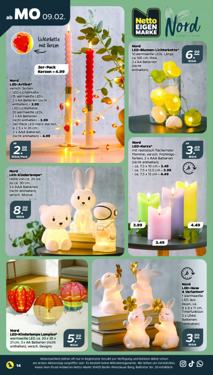 Bitte beachten Sie, dass dieser Text automatisch generiert wird und möglicherweise Fehler enthältab MO 09.02. a Netto EIGEN lu MARKE Hone Living Lichterkette x mit Herzen 9 | Nord <— LED-Blumen-| hterkette* 10 warmweiße LEDs, Länge ca.165 cm, IP44, 6= 2 x AA Batterien Stück 2er-Pack | À (nicht enthalten) Kerzen=4.99 | 4 € Nord = LED-Artikel* } versch. Sorten ? LED-Lichterkette, 4 15 warmweiße LEDs, 2 x AA Batterien (nicht enthalten) = 2.99 R LED-Lichterkette, 6 \ 20 warmweiße LEDs, 2x AA Batterien (nicht enthalten) = 3.99 2er-Pack LED-Herz-Kerzen, 02,5xH 26cm, 2 x AAA Batterien > {nicht enthalten) - 4.99 Nord ab Be Zu LED-Kerze* 49 € mit realistisch flackernder PE Stück/Pack Flamme, versch. Frühlings- Stück farben, 2 x AAA Batterien (nicht enthalten) : ca. 7,5 x10 cm=3.49 Nord : ca.7,5x125cm-=3.99 LED-Kinderlampe* : ca. 7,5 x 15 cm = 4.49 Höhe von ca. 20 bis zu ca. 30 cm, 3x AAA Batterien (nicht enthalten), versch. Motive 82 8 Ee 6 3.99 4.49 «”, = 3.49 é 30 Nord 277 à LED-Hase 1: 4 Varianten* ELAN 5 19 1 warmweife a & LED, aus Resin, ca. - 8x6x1 cm, Vas Ü Timerfunktion 2xLR44 Batterien (enthalten) Nord LED- inderlampe Lampion* EE] 99 warmweiße LED, ca. 20 x 20 x 21cm, 3x AA Batterien (nicht Er Stück enthalten), versch. Designs ‚Aktionsartikel stehen oft nur in begrenzter Anzahl zur Verfügung und können daher schon am ersten Aktionstag vergriffen sein. Es besteht keine Mitnahmegarantie. Wir bitten um Verständnis. © « Keine Non-Food-Artikel im Netto-Markt 10405 Berlin-Prenzlauer Berg, Belforter Str. 20 erhältlich. (COTES)