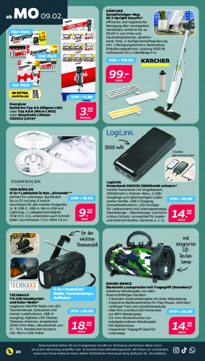 Bitte beachten Sie, dass dieser Text automatisch generiert wird und möglicherweise Fehler enthältDam KÄRCHER iger-Mo; u ab MO 09.02. 8 un SC 2 Upright EasyFix* pr effiziente und hygienische Reinigung aller versiegelten u Hartböden, entfernt bis zu af - a Cat 8 99,99 % von Viren und u 2:4 Bonus er Haushaltsbakterien, abnehm- A er eus barer Tank, 2-stufige Dampfregulierung, M k er, Er inkl. 3 Reinigungstüchern, Bodendüse, Entkalkungspatrone, Leistung 1600 W, Aufheizzeit 30 s, Kabellänge 5m an EneraizeL B+4 — Eur = a KARCHER On + H we > IMEXTRA AUFSTELLER Energizer Batterien Typ AA (I ignon LR6) EES oder Typ AAA (Mi LRO3) oder Knopfzelle Lithium CR2032 (LR14)* Packung LogiLink = 20000 mAh € 2 Geräte Alt gleichzeitig laden = ment > LogiLink MONA EN Powerbank PA0323 20000mAh schwarz* VON MÄHLEN mobile Powerbank mit eingebauten 6-in-1 Ladekabel in Box „Alroundo“* 20000mAh Li-Polmer-Akku, 2 USB- perfekt für unterwegs, Spiralkabel ‚Ausgänge zum gleichzeitigen Laden bis zu 75 cm lang, 6 versch. zweier Geräte, USB-C Eingang, ‚Anschlüsse für alle mobilen Endgeräte Schnellladefunktion, LED-Anzeige (z. B. USB-C, USB-A, Micro-USB und EE: für Ladezustand und Leistungsanzeige, Lightning), Ladegeschwindigkeit Überladungs-, Überlastung: nd Kurz- 15 W (5 V, 3 A), unterstützt auch Schnell- schluss-Schutz, kompatibel für Apple- 14 laden, Durchmesser 7 cm, Höhe 1,9 cm Stück BE und Android-Geräte, Kameras u. v. m. a = ZT fix den 5 nächsten mit BE Stromausfall integrierter LED- Taschen- € lampe ni Ne 5 2 < SOUND SIENCE >< Bluetooth Lautsprecher mit Tragegriff (Boombox)* kabellose Wiedergabe von allen TECHNAXX bluetoothfähigen Geräten TX-238 Handkurbel- + 3 Stunden Audiowiedergabe mit einer Akkuladung und Solar-Radio* - integrierte Bedienelemente für Play/Pause, nächster/ tragbares AM/FM-Radio mit LED- vorheriger Track und Lautstärkeregelung Taschenlampe, Solarpanel und + USB-Port und MicroSD-Kartenslot Handy-Ladefunktion, USB-A zur MP3-Wiedergabe Ausgang, digitales LED-Display, + 3,5-mm-Klinkenbuchse zur Teleskop-Antenne, eingebauter kabelgebundenen Wiedergabe 2000 mAh Akku, Akkulaufzeit von + FM-Radiomodus 12 - 15 h, Handkurbel Dynamo, 18 - integrierter Tragegriff ideal für 14° inkl. Micro-USB-Kabel Stück Een unterwegs ‚Aktionsartikel stehen oft nur in begrenzter Anzahl zur Verfügung und können daher schon & 2 ‚am ersten Aktionstag vergriffen sein. Es besteht keine Mitnahmegarantie. Wir bitten um Verständnis. d © Keine Non-Food-Artikel im Netto-Markt 10405 Berli Prenzlauer Berg, Belforter Str. 20 erhältlich.