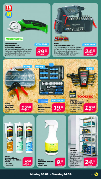 Bitte beachten Sie, dass dieser Text automatisch generiert wird und möglicherweise Fehler enthält' er un Le) ES ed 3) (pp nice fai Hammersmith Mauk Sharp Spin Akku Lithium-Schrauber 3,6 V* Universalschneider* mit LED-Arbeitslicht im praktischen mit wechselbarer Rundklinge, Mate- Koffer, mit 49 Carbon-Stahl-Bits und rialien bis 6 mm Stärke schneiden, Bit-Halter, max. Drehmoment: komfortables Handling durch inte- 5 Nm, Batterie 1300 mAh Lithium- 24° grierten Arretierungsknopf Een lonen, Aufladezeit 3 Stunden CT ZA ds > PR = Em Pre | = u er ne EN = = at MAT Fer né Ze lo > ‘+ PR € CR Lx “ = EIGEN \ MARKE TOOLTEC: or ge 4, TOOLTEC r = à u 5-tlg. Schrauben- eng. schlüssel-Set* *; Hohiraum- \GröBen 8, 10, 13, dübel-Set* Güde > EE Steckschlüssel | 14und17 mm} inkl: ontage- Ÿ Bitsatz* mitRatschen- , En À Funktion . ES Fe 2} „ Borug. ? = Im u ze geef! u u — m | Pattex Pattex oon co A MG noe En g | A = | En we u | É = : | Schwer- lastregal* Ee ME el ca. 172x 75x30cm * E | Pattex mit 5 Fachböden, Montagekleber, Belastbarkeit Acrylat oder ikon Kluthe pro Boden max. weiß* Schimmel-Schutz- 75 kg, Material = Spray* Stahl, MDF 42 1Liter 2.87 400 g/310 mi 1 Liter = 19.98 500 ml Stück (ohne Inhalt) Montag 09.02. - Samstag 14.02. 1©Q