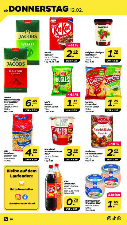 Bitte beachten Sie, dass dieser Text automatisch generiert wird und möglicherweise Fehler enthält» DONNERSTAG 02. CNN ZÖRBIGER 6, JACOBS BEI NS 1% Nestlé 49 Cereals* Original Zörbiger Konfitüre* versch. Sorten versch. Sorten 17 200 - 400 g 2559 1kg=12.45- 6.23 1Kg=7.02 JACOBS Ve —— MEISTER [7 TANT ja copy foe QE ABUGLES À | A -44%% Jacobs — oder Auslese* Meisterröstung 49 Lorenz 29 gemahlen Lay's Bugles* Crunchips* versch. Sorten versch. Sorten 1° versch. Sorten 500 g 759 1509 1Kg=12.98 1kg=14.80 1kg=8.60 ai = DREISTER! XL Di ALES Fleischbällchen UTTER las Napoli-Art ee ea a CUS EG Ex KE 0% x Ar + XOX a 99 Studentenfutter Maryland Dreistern Erdnüsse* XXL* Fleischbällchen* gesalzen oder versch. Sorten an versch. Sorten 22 ungesalzen 4509 5409 1000 g 1Kg=8.87 1Kg-4.98 =" Bleibe auf dem IN Laufenden: en Ee | Vita versch. Sorten Limonade* > 2 1,5 Liter Netto Newsletter Œ zzgl. 0.25 Pfand Le ALiter = 0.53 CT 90 Wurst im Glas* Die Thüringer 89 @nettodeutschland versch. Sorten 1309 0? 1Kg=14.54 @ ze @Od®