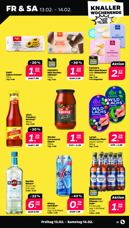 Bitte beachten Sie, dass dieser Text automatisch generiert wird und möglicherweise Fehler enthält>» ni MICH ASCHOxO. N- x = = = me NI Le tto | Netto FINTON’S Kathi FINTON’S Mini Amerikaner Kakao Kronen* En röllchen* Mini Kuchen- En oder Schnecken* 1759 1759 3009 1kg=740 VJ 1kg=9.09 1kg=210 SR tiofgekühlt jon Mn e Jan A Jütro Tomaten- ketchup* Kt 4509 LE 1kg=3.09 4 Dee ER 39 Werder Lar Currywurst 2e Wildlachs-Filet* Sauce* versch. Sorten PE mw 5009 2009 1kg=3.98 Ikg=1145 ez) = ii Ua PE à Martini g 4 Bianco* 14,4% Vol. 1Liter =9.32 0,75 Liter Va, | | NORDGOLD Pilsener oder 99 Mixery 79 Gold* Iced Blue* 6x0,5 Liter 0,5Liter zzgl.1.50 Pfand En ALiter= 1.58 zzgl. 0.25 Pfand 1Liter=0.66 3Liter