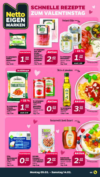 Bitte beachten Sie, dass dieser Text automatisch generiert wird und möglicherweise Fehler enthältNetto EIGEN Antigastieller i any MARKEN > SÜDTIROLER we Fa Ed (a En Lepage. u er En MOZZARELLÀ zog: en bn ee, — 4 Ital. Süd- la campagna CT = tiroler Es Schinken- la campagna speck oder la campagna À Büffel- mozzarella* schinken* Rosmarin- Olivenmix* versch. Sorten 1259 1009 1309 ng 15.92 ing: =24.90 1Kg-9.92 EED Serviervorschiag Pasta al romodoro —N Er | =. BC A TEL = a € ee, - N, ne la campagna Gehackte oder Frische la campagna geschälte Tomaten* la campagna Tagliatelle* versch. Sorten Olivenöl* 600 g 4009 500 ml Srviervorschlag 1Kg=2.82 ing, 21.73 ALiter =7,98 Knuspermisli Quark Dessert sBIO RNUSPERNOEE a Er NV À Speisequark 1 el DR % R 04 Bir Tast. frija GOoBIO Speisequark Knusper- Bellafonde ar 40 % Fett müsli Beeren Blütenhonig* i.Tr.* oder Schoko* versch. Sorten Srviervorschiag 1Kg=2.76 2509 5009 1Kg-5.98 500 g 1kg=4.98 Montag 09.02. - Samstag 14.02. o5 ©