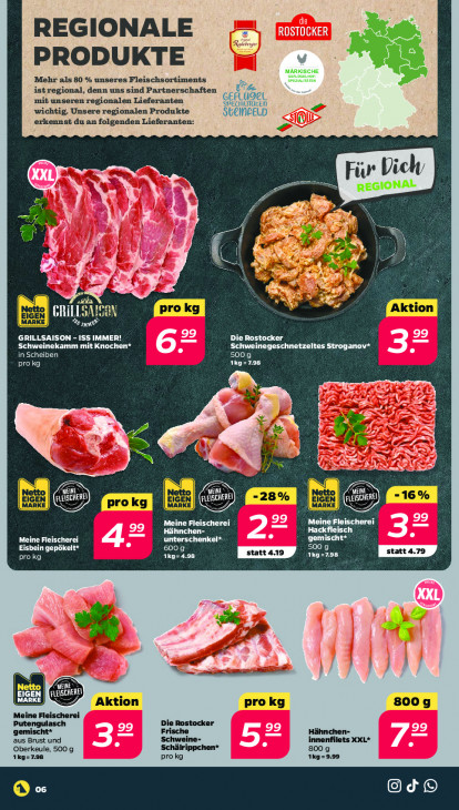 Bitte beachten Sie, dass dieser Text automatisch generiert wird und möglicherweise Fehler enthältREGIONALE à ut. 4 PRODUKTE MÄRKISCHE Re Mehr als 80 % unseres Fleischsortiments Ö dr ist regional, denn uns sind Partnerschafte: mit unseren regionalen Lieferanten SPELIAUTAGEN wichtig. Unsere regionalen Produkte StEINFELD erkennst du an folgenden Lieferanten: U) REGIONAL Fi RE we ES Fed Pi \ ( ETEN ei 1] ETS GRILLSAISON - ISS IMMER! Die Rostocker Schweinekamm it Knochen* Schweinegeschnetzeltes Stroganov* in Scheiben ER CRTC) TRES aie Sr a JF KeS SS. N 12 (HUE "28% "16% Meine Fleischerei LOTO ET Hähnchen- Hackfleisch al unterschenkel* FES 3 Er Par 600 g statt 4.19 1kg LT statt 4.79 pro kg 1kg=4.98 Je Ze 7 En Netto EN (FLEISCHEREI Aktion prokg 800g Meine Fleischerei Putei Die Rostocker gemischt* Hähnchen- aus Brust und Schweine- innenfilets XXL* Oberkeule, 500 g Schälrippchen* 800 g 1kg= 798 pro kg 1Kg-9.99 @Od® & os