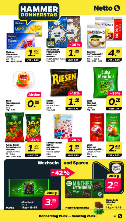 Bitte beachten Sie, dass dieser Text automatisch generiert wird und möglicherweise Fehler enthältHAMMER Netto © DONNERSTAG L Meßmer € h 1 SSIMO Limone Dr MÜSLI ee @TASSIMO| Ws | N JACOBS du ee) CA OP m Hr add & EL A Pi) pen 69 BREAKFAST Tassimo Meßmer Ländertee* Müslioder FROM BELL’S Kaffeekapseln* versch. Sorten Granola* versch. Sorten 42 40-509 versch. Sorten, 750.9 118,4 - 268 g 1kg = 42.25 - 32.80 tige EED 1kg = 37.92-16.75 WEL Euka Menthol QIE 3 al 49 79 Trolli Fruchtgummi Storck Riesen* Euka Menthol Burger* O= versch. Sorten Bonbons* 50 g 2319 2509 1kg=19.80 1kg=645 1 And‘ EN 10.9 0, Ÿ à u ar 8 oi Si Le 8 A en Farmer's Snack funny-frisch Gefrier- Lindt Cornados oder getrocknete Früchte* Tafel mit Jumpys* versch. Sorten 12 versch. Sorten 12 versch. Sorten ‚Alkohol gefüllt* 22 75-909 259 1009 1Kg=17.20 -14.33 1Kg= 79.60 1kg=24.90 UE LE und Sparen poco Bella gogo Gala AFTER DINNER \ 7 6 ZZ CPL © Choco Bella After Eight* Minthies* POUF 200 g Marke 1kg=19.95 Netto-Eigenmarke ‘à 1kg= 11.45 Donnerstag 19.02. Samstag 21.02. 2 Q