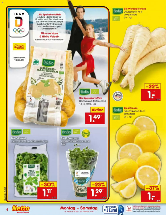Bitte beachten Sie, dass dieser Text automatisch generiert wird und möglicherweise Fehler enthältBio Wurzelpetersilie Deutschland, KI, Il TEAM = „Bio Speisekartoffeln 250 g Schale sind die ideale Basis für (4.- /kg) Sportler und Sportlerinnen Sie liefern schnelle Energie durch Kohlenhydrate und sind reich an wichtigen Mineralstoffen.“ OP Minerva Hase & Nikita Volodin Eiskunstlauf-Vize-Weltmeister Netto) De Premium Partner Olympia Team Deutschland + > Green par Cr LE où à Zum vw > a a / ‚ A rd 5 is -22 u f » | mn Bio Speisekartoffeln 27 1 Deutschland, festkochend 1,5 kg (0.99 / kg) >= Bio Zitronen Aktion | GES Italien/Spanien, KI. Il 500 g Netz (2-/kg) - Lcd A me = u WA ET HS Italien, KI.11, 100 g Schale (11.107 kg CSC nette ei «ein B + En : A pe W ; LL 29 J 7 5 a Ci id KW 08 / BeSB EE 100 °Punkte jl a rel mit lese Hinweis ind im Aktonsaetraun auch beste Montag - Samstag I Weinen Pe U il ta . Vaio Marken-Discount 16. Februar 2026 - 21. Februar 2026 = 1 Euro! online Korg Angaben Inden Si beim jeeligen rkelim One Stop
