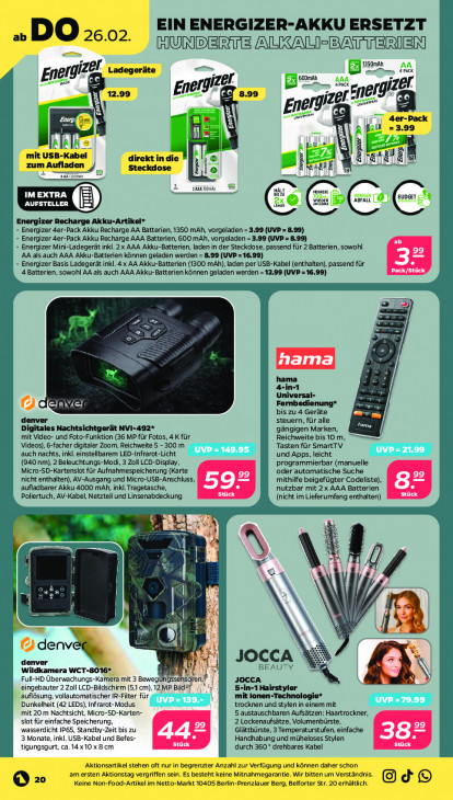 Bitte beachten Sie, dass dieser Text automatisch generiert wird und möglicherweise Fehler enthältEIN ENERGIZER-AKKU ERSETZT ab DO 26.02. HUNDERTE ALKALF-BATTERIEN pack AA zer Ladegeräte 600mAn 8 B50mAh Energ arch je enen SPA AAA nergizef zer 12.99 En ouate Vs, 8.99 zor 455 BE ae 4er-Pack i fau = 3.99 il) IR IR A Ale mit USB-Kabel - Ep h zum Aufladen Steckdose Bi ebde = io nn En HAUT renner IM EXTRA Er N AUFSTELLER ME weder 5 LL AUDI € jizer Recharge Akku-Artikel* Energizer 4er-Pack Akku Recharge AA Batterien, 1350 mAh, vorgeladen =3.99 (UVP = 8.99) Energizer 4er-Pack Akku Recharge AAA Batterien, 600 mAh, vorgeladen =3.99 (UVP = 8.99) Energizer Mini-Ladegerät inkl. 2x AAA Akku-Batterien, laden in der Steckdose, passend für 2 Batterien, sowohl ‚AA als auch AAA Akku-Batterien können geladen werden = 8.99 (UVP =16,99) Energizer Basis Ladegerät inkl. 4x AA Akku-Batterien (1300 mAh), laden per USB-Kabel (enthalten), passend für 4 Batterien, sowohl AA als auch AAA Akku-Batterien können geladen werden 12.99 (UVP =16.99) = 77 ap > zer 4 hama 4-in-1 Universal- ACAYCI Fernbedienung* Ka 5 bis zu 4 Geräte ML) denver steuern, für alle Digitales Nachtsichtgerät NVI. 192* ‚gängigen Marken, tama Reichweite bis 10 m, === mit Video- und Foto-Funktion (36 MP für Fotos, 4 K für Videos), 6-facher digitaler Zoom, Reichweite 5 -300 m Tasten für Smart TV ‚auch nachts, inkl. einstellbarem LED-Infrarot-Licht und Apps, leicht (940 nm), 2 Beleuchtungs-Modi, 3 Zoll LCD-Display, programmierbar (manuelle Micro-SD-Kartenslot für Aufnahmespeicherung (Karte oder automatische Suche nicht enthalten), AV-Ausgang und Micro-USB-Anschluss, mithilfe beigefügter Codeliste), ‚aufladbarer Akku 4000 mAh, inkl. Tragetasche, nutzbar mit 2x AAA Batterien Poliertuch, AV-Kabel, Netzteil und Linsenabdeckung (nicht im Lieferumfang enthalten) An è Ma N = 5, w 1 % 4 \ | | 54 } Ù denv al 4 denver JOCCA Wildkamera WCT-8016* Et dr BEAUTY \ Full-HD Überwachungs-Kamera mit 3 BewegUngssehsören,| JOCCA eingebauter 2 Zoll LCD-Bildschirm (5,1 cm), 12 MP Bild“? -in-1 Hairstyler auflösung, vollautomatischer IR-Filter für, mit Ionen-Technologie* Dunkelheit (42 LEDs), Infrarot- Modus Ka trocknen und stylen in einem mit mit 20 m Nachtsicht, Micro-SD-Karten- 5 austauschbaren Aufsätzen: Haartrockner, slot für einfache Speicherung, 2 Lockenaufsätze, Volumenbürste, wasserdicht IP65, Standby-Zeit bis zu Glättbürste, 3 Temperaturstufen, einfache 3 Monate, inkl. USB-Kabel und Befes- Handhabung und müheloses Stylen tigungsgurt, ca. 14x10x8cm durch 360 ° drehbares Kabel Aktionsartikel stehen oft nur in begrenzter Anzahl zur Verfügung und können daher schon ‚am ersten Aktionstag vergriffen sein. Es besteht keine Mitnahmegarantie. Wir bitten um Verständnis. d © @ zo Keine Non-Food-Artikel im Netto-Markt 10405 Berlin-Prenzlauer Berg, Belforter Str. 20 erhältlich.