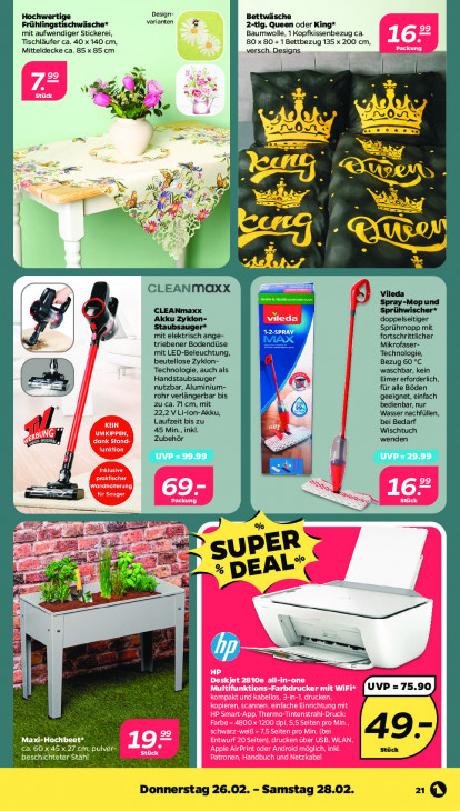 Bitte beachten Sie, dass dieser Text automatisch generiert wird und möglicherweise Fehler enthältDesign- varianten Bettwäsche Fran Ecesscher $ 2-tig. Queen oder King* mit aufwendiger Stickerei, Baumwolle, 1 Kopfkissenbezug ca. Tischläufer ca. 40 x 140 cm, 80 x 80 + 1 Bettbezug 135 x 200 cm, Mitteldecke ca. 85x 85 cm versch. Designs, Ÿ DCE Nl > Zj ul » 9) or m» S As" NY Rp 5 PTE ge an) fe, gi % UN) 6 EN De CLEANMOXX Vileda ps au Spray-Mop und CLEANmaxx à) Akku Zyklon- doppelseitiger SPRAY Sprühmopp mit mit elektrisch ange- fortschrittlicher triebener Bodendüse Mikrofaser- mit LED-Beleuchtung, Technologie, beutellose Zyklon- Bezug 60 °C Technologie, auch als | waschbar, kein Handstaubsauger Eimer erforderlich, nutzbar, Aluminium- für alle Böden rohr verlängerbar bis geeignet, einfach zu ca. 7l cm, mit l | bedienbar, nur 22,2 V Li-lon-Akku, LÔ Wasser nachfüllen, Laufzeit bis zu bei Bedarf 45 Min., inkl. Wischtuch Zubehör wenden UVP RSI = au ee SE LEE ad Es ER € SU „I il C4 5 AL’ nd D DE > D, À el es Be Eee me = ° Maxi-Hochbeet* Ca.60 x.45 x 27.cm, pulvér- er beschichteter Stähl Donnerstag 26.02. - Samstag 28.02. 1©Q