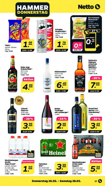 Bitte beachten Sie, dass dieser Text automatisch generiert wird und möglicherweise Fehler enthältHAMMER Netto © DONNERSTAG Pufuletti issnack* . RC) 5 ñ KL Ex) 9.29 D F ss AK zZ Pringles LE Stapelchips* versch. Sorten Gex 1659 1kg=10.85 PREIS: 79 Takis* versch. Sorten 12 1009 1kg=19.90 = ca Kentucky Highway 3 American Blended Baba Jaga Kräuterlikör* Whiskey* 30 % Vol. Küstennebel* 40 % Vol. O7 Liter 21,8 % Vol. 1Liter =11.41 0,7 Liter ALiter =7.13 0,5 Liter GN 1Liter=12.98 KE 1 * F I; 2 pa nu 99 it : 6= 7= =, ® acu, ma 2 = | E ce Chianti LE Baden Grand Sud rs Riserva* Trollinger Merlot oder 0,75 Liter mit Lemberger* Chardonnay* % 1Liter =5.32 1Liter = 1Liter 2 | um 32 22 [ 32 7 um Il fr IM id A Gi À meh DA Tu lb BT Lo inekHeine MARKE EIGEN ni wii ; MARKE EIGEN Mecklenburger Quelle Mecklenburger Aqua Fresh* Heineken STIER-BIER versch. Sorten 50 Export* 99 6 x05 Liter 6x 0,33 Liter zzgl. 1.50 Pfand 32 20x 0,5 Liter 3 Liter zzgl. 1.50 Pfand 1 1,98 Liter 10 Liter zzgl. 3.10 Pfand, 1Liter = 0.50 ALiter = 2.02 1Liter =0.60 Donnerstag 26.02. Samstag 28.02. 2