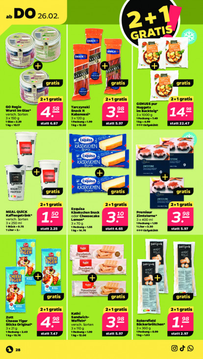 Bitte beachten Sie, dass dieser Text automatisch generiert wird und möglicherweise Fehler enthältab DO 26.02. u DEA EF, et 7 A 9 A Seh = À TS LA À > sc ZB wel fl D vas pen ges Je 4 a „A Hi “ À #1 gratis 2+1gratis / 2+1 gratis Go io GENUSS pur Wurst im Glas* Snack It Nugget: versch. Sorten Kabanossi* im Backteig* 3x1000 g 7.49 3x150 g 1 Glas = 2.29 3x1209 1Packung =1.99 1kg= 1Packung 4.99 kg = 1017 1kg=12.50 #88 tiefgekühlt } f ” el Espresso KUCHEN MN nt, ss ns ES KASEROCHEN y = e SNACK NE nz Orr u a HIGH, NACK, ICHEN À PROTEIN EED gratis EG kü = 2+1gratis 2+1gratis 2+1gratis Exquisa MEAL QUICK Käsekuchen Snack Premieur Kaffeegetränk* oder Cheesecake Zimtsterne* versch. Sorten Lemon* 3x400 ml 3x250 ml 3x70g 1Packung = 1.99 1 Stück = 0.75 1 Packung 1Liter =3.30 1Liter 18 14.76 888 tiefgeküit al ur US us Sandwich ren [ONE ES Weifeln ld cn HS wich ICHEESE ug Len re ITS TE gratis skins alken TED == 2+1gratis 2+1gratis ö nu 2+1gratis Kathi Sandwich- Cheese Waffeln“ Bakersfield Sticks Original* versch. Sorten 3x219 3x10g 3x3609 1 Packung = 2.49 ckung =1.99 1Packung = 0.99 1kg=19.76 1Kg=183 ED Od ® @ ze